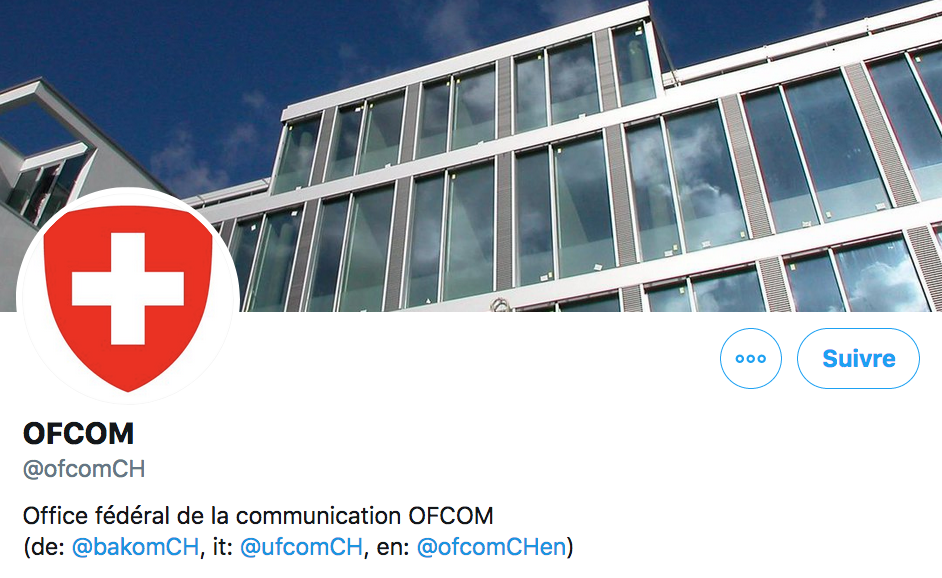 Pour communiquer sur Twitter, l'OFCOM utilise quatre comptes : bakomCH pour les informations en allemand, ofcomCH pour le français, ufcomCH pour l'italien et ofcomCHen pour l'anglais. L'office n'a toutefois plus accès à ses fils depuis le 28 septembre 2020. Twitter a en effet suspendu ses comptes, sans avertir ni fournir aucune explication.