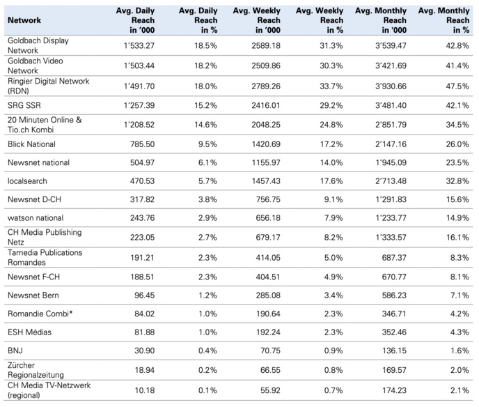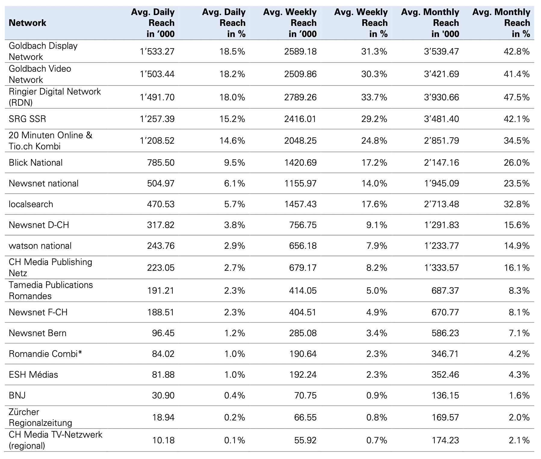 En Suisse, ce sont SRF, 20 Minuten et Blick qui présentent les pénétrations les plus élevées au second semestre 2022. SRF est même la seule plateforme en ligne qui a été visitée quotidiennement par plus d’un million de personnes (1 014 940). Elle est suivie par 20 Minuten, avec une moyenne quotidienne de 862 680 visiteurs, puis par Blick et ses 754 010 personnes. Les autres brands du top 10 sont blue News, 20 Minutes, local.ch, search.ch, watson, RTS et Tages-Anzeiger. Les réseaux participants qui affichent les pénétrations les plus élevées sont Goldbach Display Network (1 533 270), Goldbach Video Network (1 503 440) et Ringier Digital Network (1 491 700).