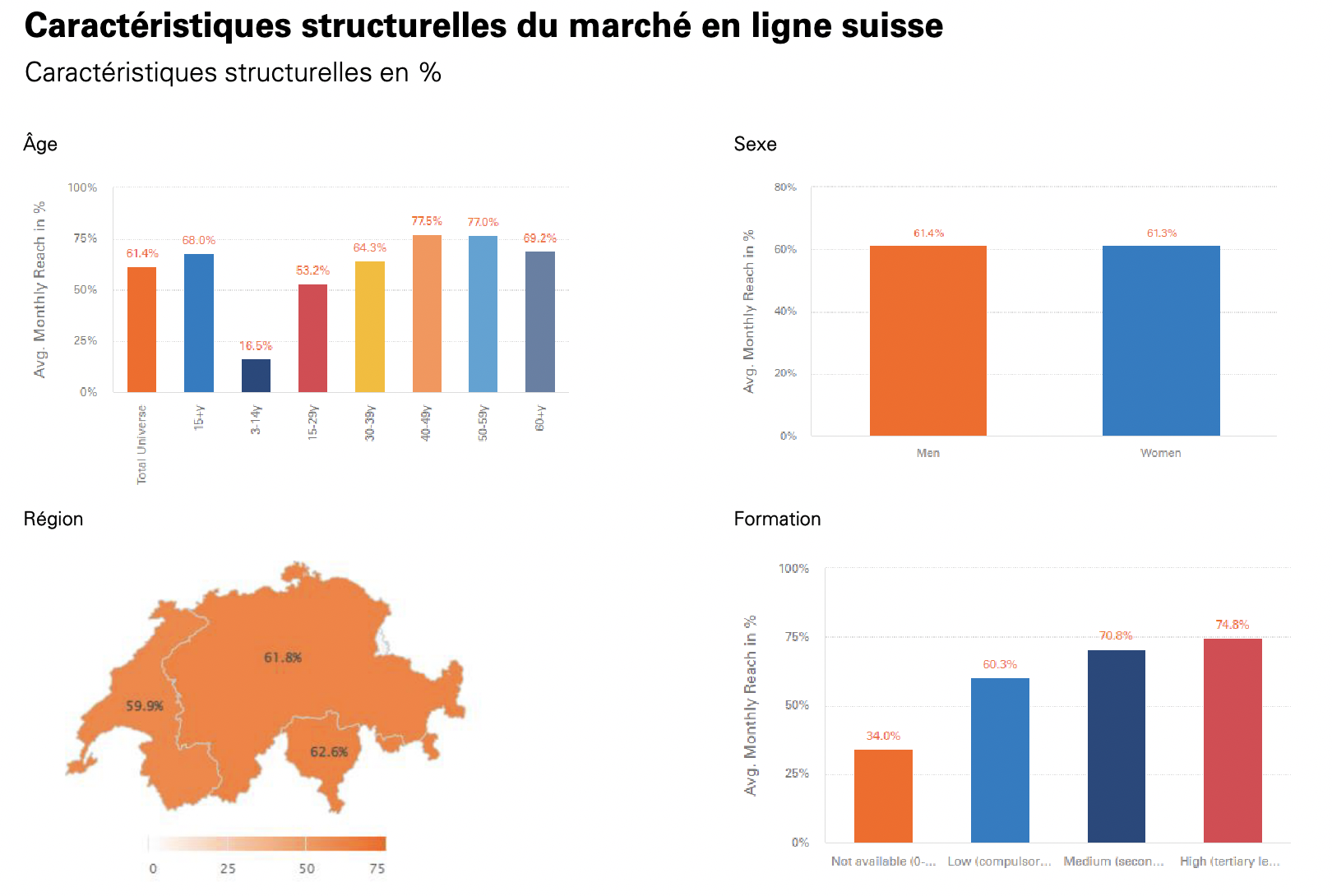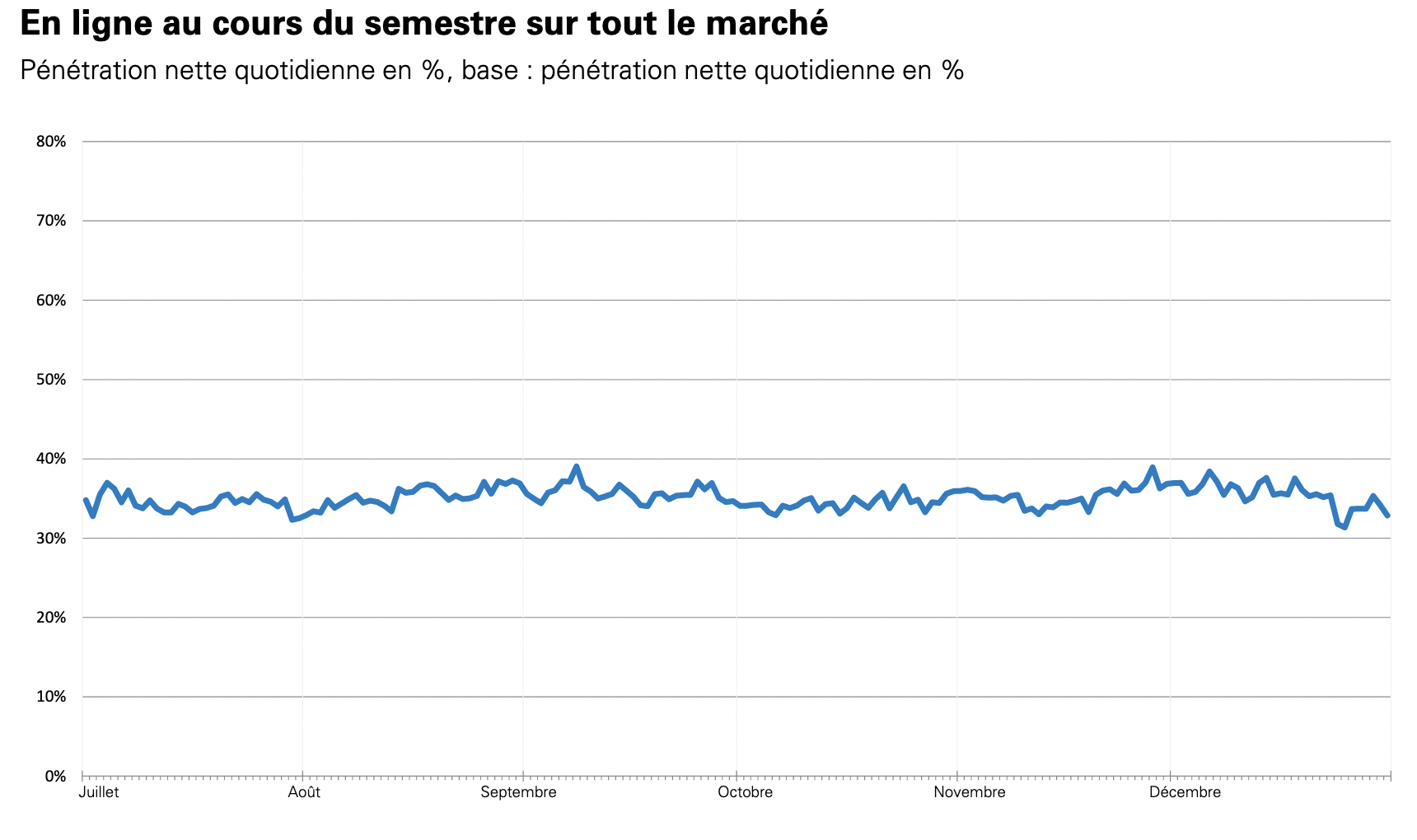 Les chiffres semestriels de la radio et de la télévision sont ainsi complétés pour la première fois par ceux de l’utilisation des offres en ligne participant à la recherche. En moyenne mensuelle, plus de cinq millions de personnes ont visité les plateformes en ligne intégrées à la mesure, ce qui représente une part de 61 % de la population. Ces chiffres se réfèrent aux personnes à partir de 3 ans domiciliées en Suisse. À l’échelle hebdomadaire, la moitié de la population s’est rendue sur ces plateformes au moins une fois dans la semaine. Les médias en ligne participants ont ainsi atteint 4.2 millions d’utilisateurs par semaine en moyenne, soit une pénétration nette de 51%. À l’échelle quotidienne, les chiffres sont de 2.9 millions de personnes ou 35% de la population.