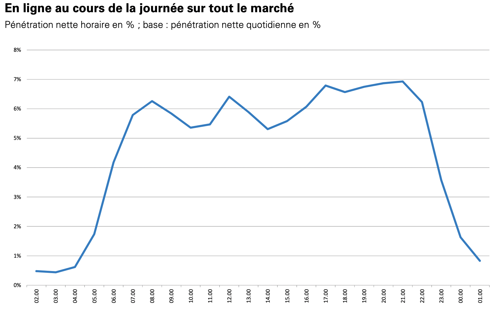 Les Online Content Audience Data mettent à disposition une mesure quotidienne de l’audience en ligne qui renseigne sur les personnes se trouvant derrière les machines. Le marché dispose ainsi de données à haute valeur utile. Il est par exemple possible, pour les brands en ligne, d’établir les caractéristiques structurelles de l’utilisation et de présenter des courbes d’audience jusqu’à l’échelle horaire. Il en ressort que les médias en ligne suisses sont utilisés tout au long de la journée, avec des pics le matin et à midi et les valeurs les plus élevées le soir. Les samedis et les dimanches présentent des courbes globalement similaires, mais légèrement décalées dans l’horaire quotidien. L’utilisation commence à augmenter à une heure un peu plus tardive, mais est ensuite légèrement plus élevée que pendant les jours ouvrables, surtout les dimanches. Il n’y a en outre pas de pic de midi pendant les week-ends.