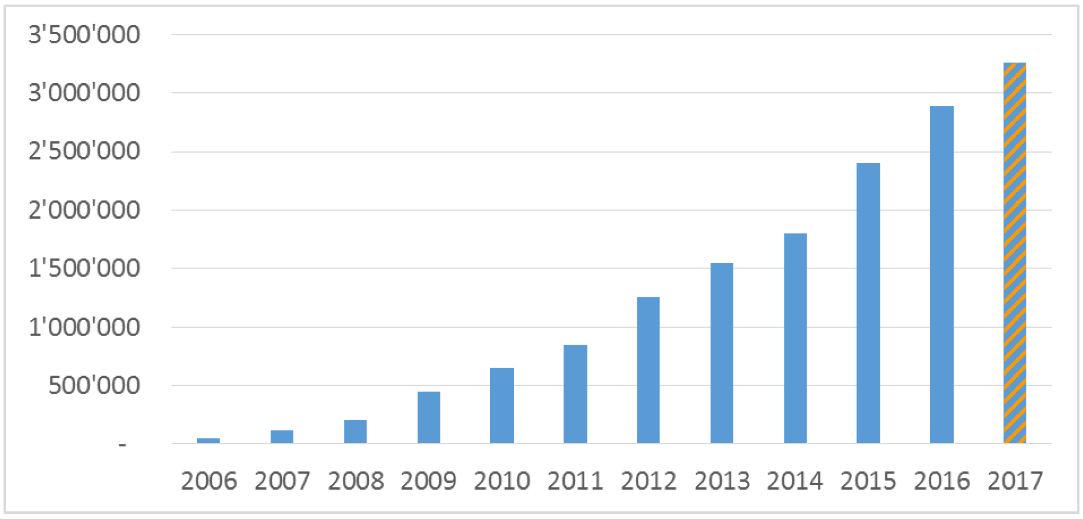 Appareils DAB+ vendus en Suisse entre 2006 et 2017. En juin 2017, elles atteignaient 3 260 800 unités (sources : importateurs, commerçants, GFK) © OFCOM