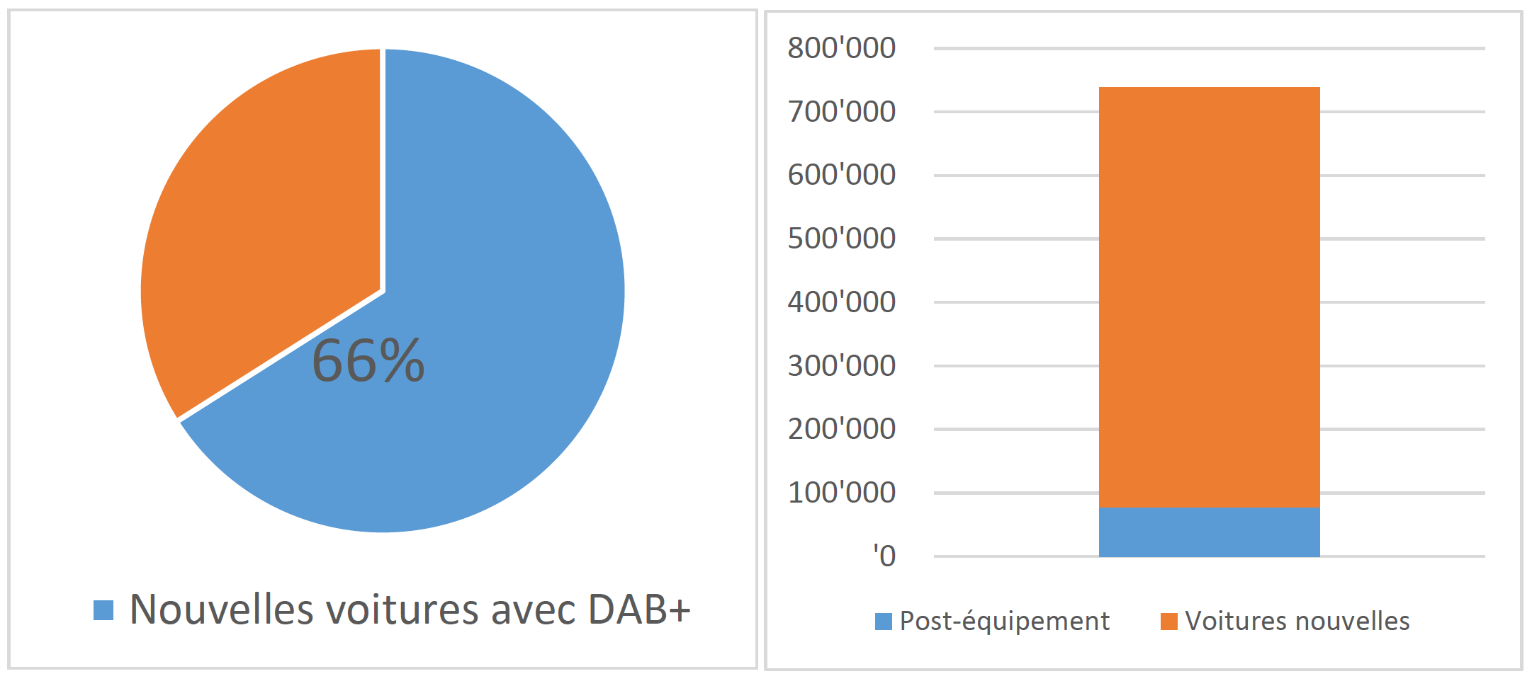En 2016, 66% des nouvelles voitures en série sont équipées d'un appareil DAB+. Fin 2016, 740 000 véhicules étaient équipés d'un appareil DAB+ (sources : MCDT, Weer) © OFCOM