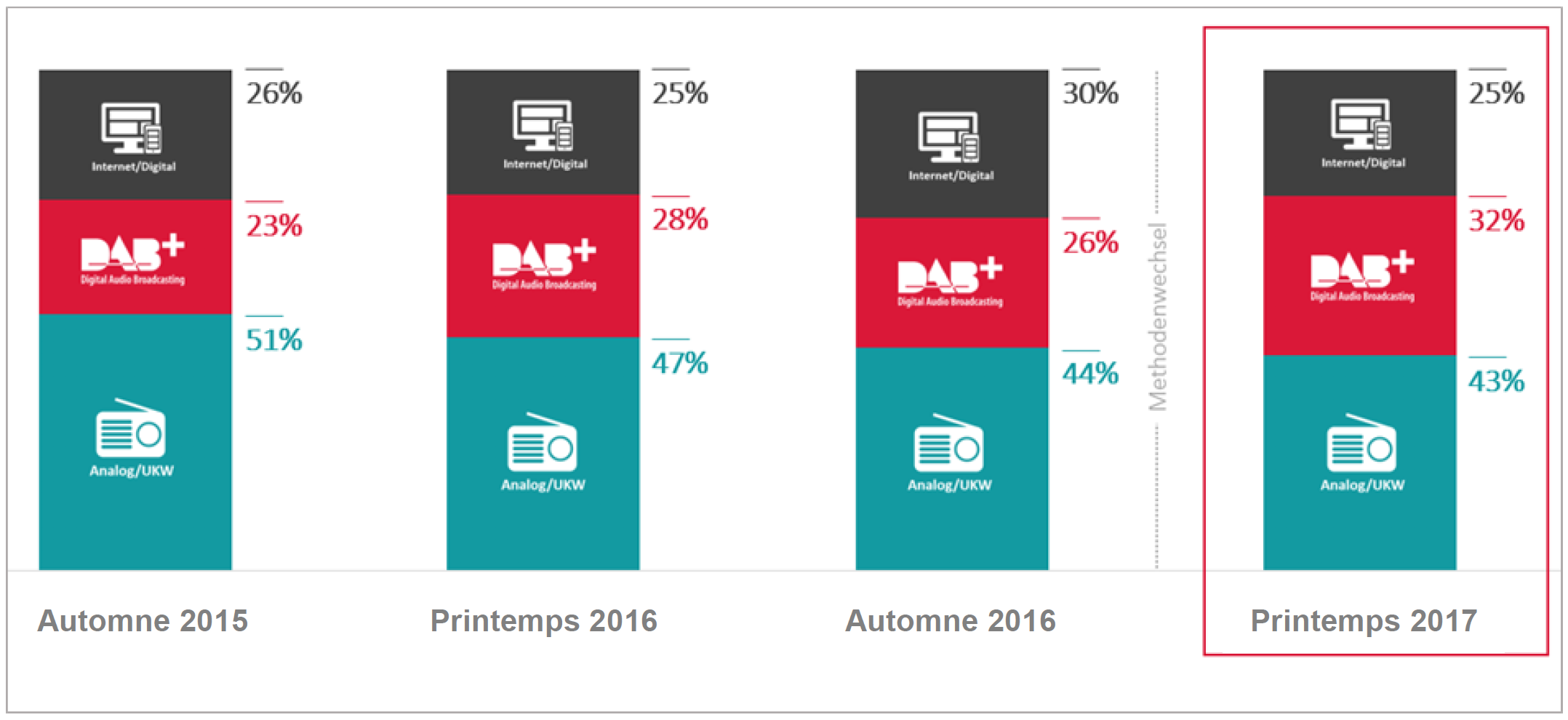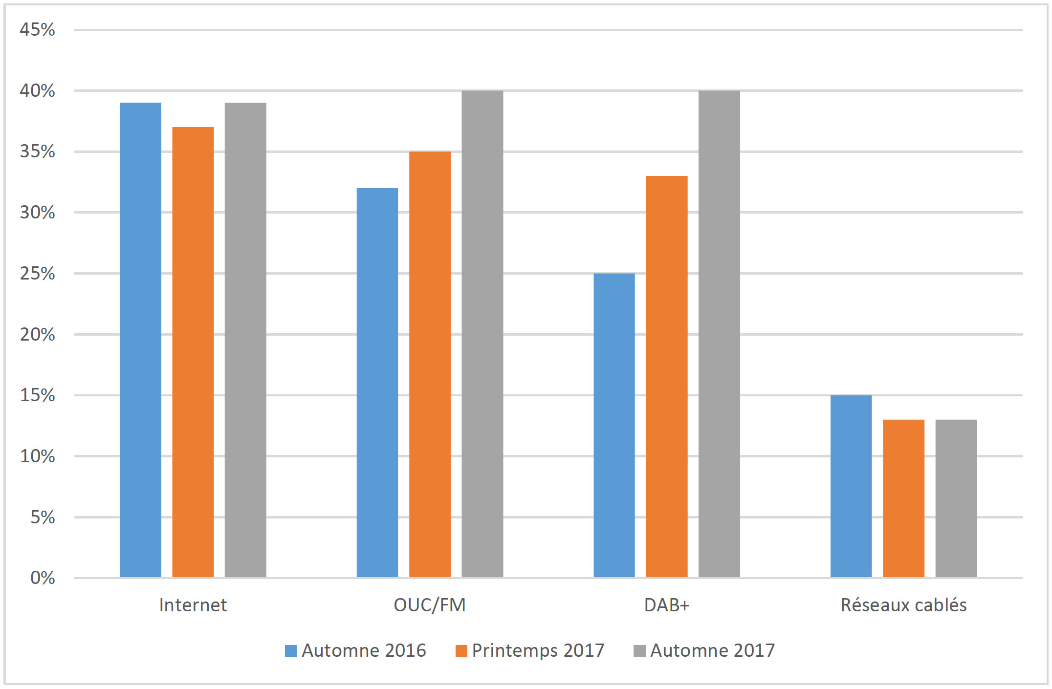 En deux ans, le temps d'utilisation numérique de la radio s'est ainsi accru de 10 points de pourcentage, passant de 49% en automne 2015 à 61% en automne 2017. Dans le même temps, l'utilisation des programmes OUC a reculé de 10 points, de 51% à 41%. L'avancée de la radio numérique est principalement soutenue par le DAB+. La part de cette technologie s'élève désormais à 34%, en hausse de 11 points depuis l'automne 2015. La notoriété du DAB+ enregistre une forte hausse. En 2016, 25% des personnes interrogées sur mandat de l'OFCOM connaissaient cette technique de diffusion; six mois plus tard, cette proportion s'élevait déjà à 33%.