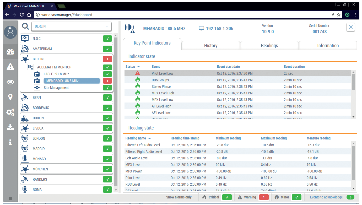 Installée sur un serveur puissant, cette solution de surveillance globale peut relier un vaste réseau d’équipements SNMP basés sur plusieurs sites. Elle permet une recherche sur le réseau pour une configuration automatique, possède une interface intuitive et inclut une bibliothèque de MIBs des plus grands fabricants d’équipements de diffusion. Cette solution peut aussi bien convenir à la surveillance simple d’une station unique qu’à un réseau international nécessitant un système de contrôle total. Quel que soit la taille, une vue cartographique offre un aperçu rapide de l’état du réseau entier. L'équipe de Worldcast Systems sera présente à l'IBC à Amsterdam sur le stand 8.C58 afin de présenter ses différents produits.