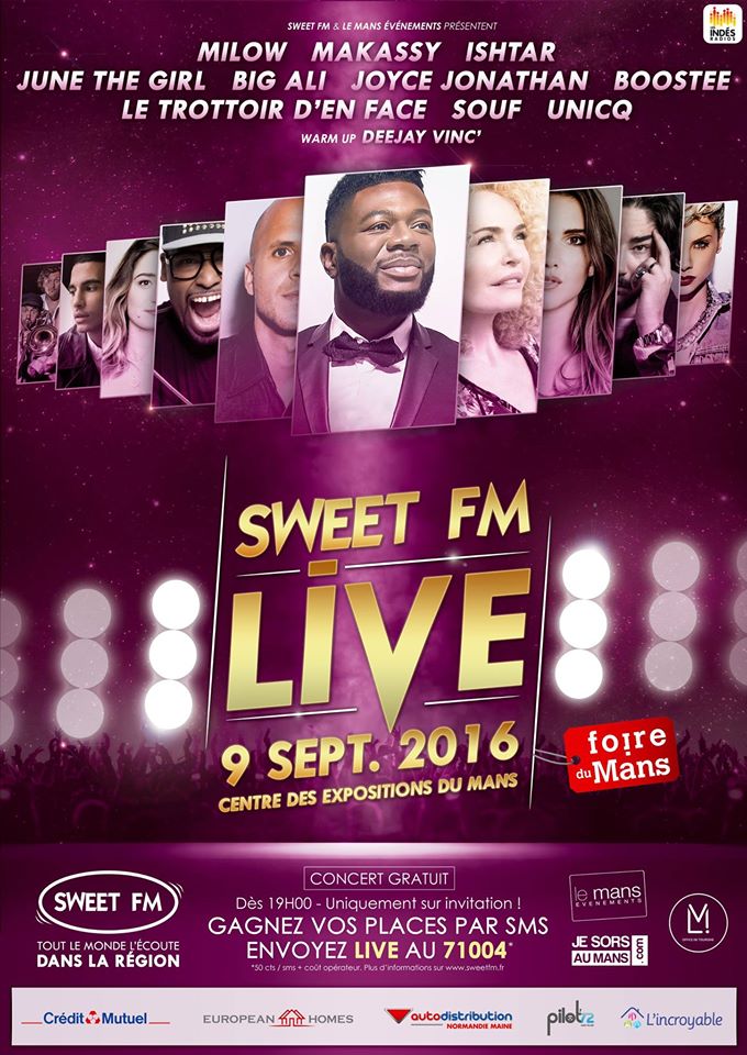 WT - Le Sweet FM Live, que nous organisons pour la troisième année consécutive, est effectivement devenu un événement majeur de la rentrée pour Sweet FM. C'est une occasion unique d'aller à la rencontre de nos auditeurs et de récompenser leur fidélité en faisant venir à eux plus d'une dizaine d'artistes nationaux et internationaux. C'est aussi un moment important qui galvanise l'équipe de la radio, avec beaucoup de travail et d'investissement en amont mais une énorme satisfaction d'organiser et de vivre une si belle fête tous ensemble. Nous sommes fiers de recevoir cette année plusieurs artistes internationaux (Milow, Big Ali, Ishtar) et des artistes majeurs du moment (Joyce Jonathan, Makassy, Souf...). Le concert aura lieu cette année dans le cadre de la Foire du Mans, co-organisateur de l'événement.
