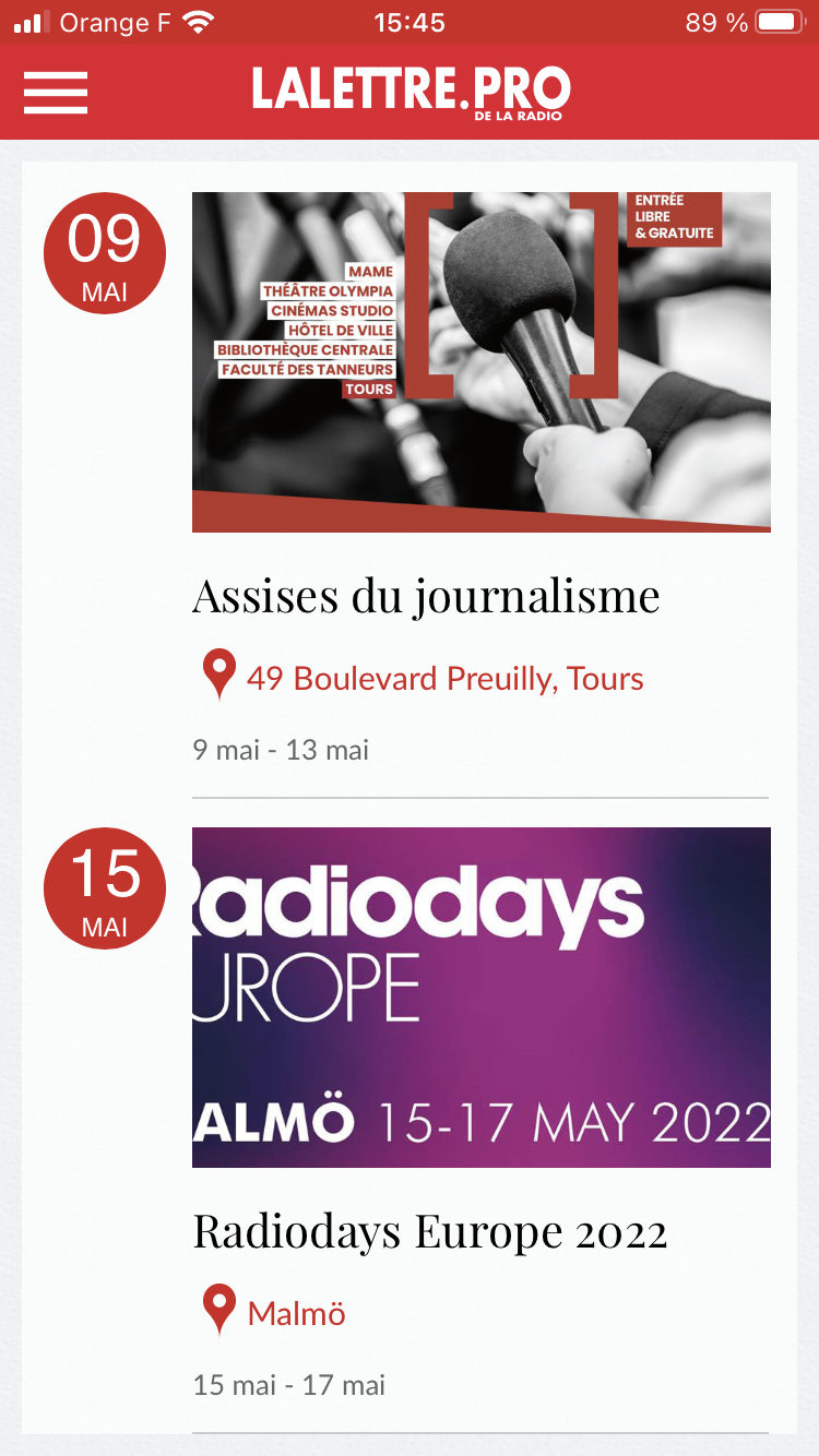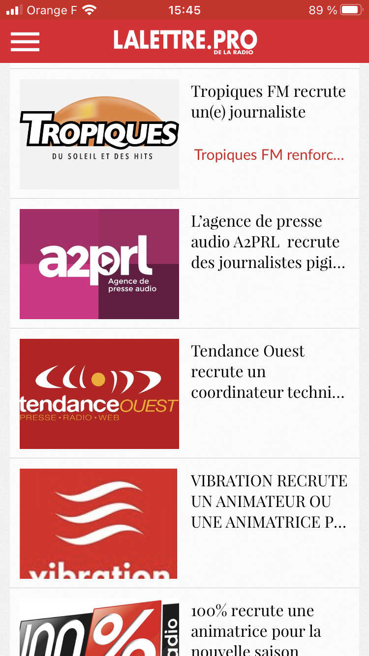L’application de La Lettre Pro de la Radio permet donc de suivre en temps réel toute l’actualité quotidienne de la radio. Sous la forme d’articles, vous bénéficiez d’une vision et d’une analyse professionnelles de tous les secteurs de la radio : journalisme, nouveautés techniques et digitales, matériels, applications, programmation musicale, production, publicité audio, Imaging, emploi, consulting radio, invités, nominations, juridique, partenariats…