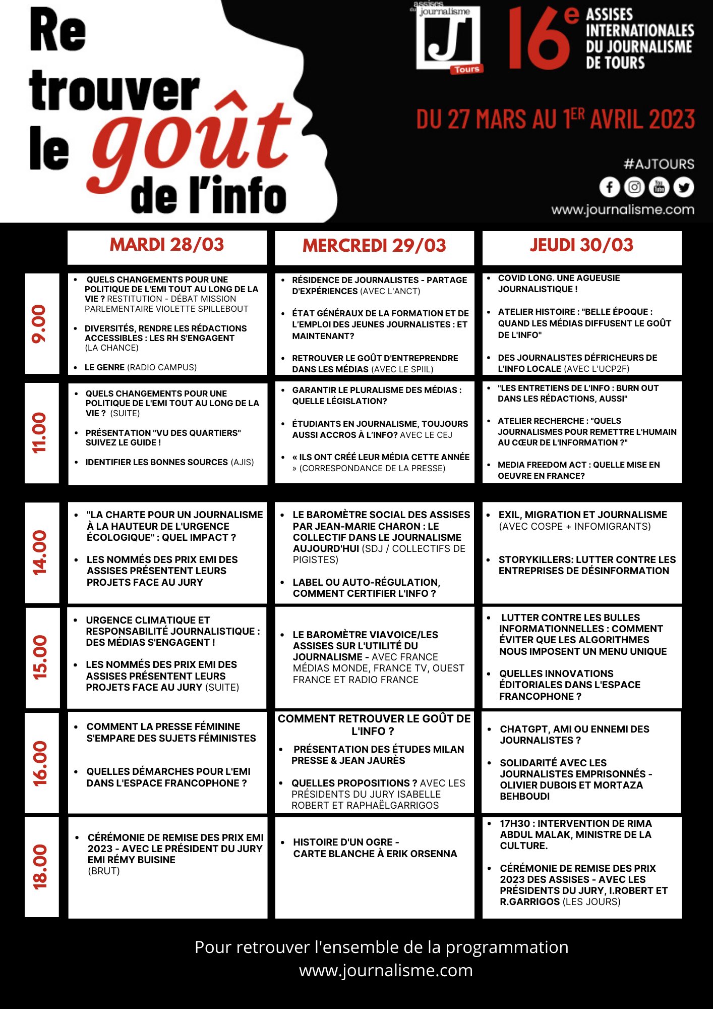 Rappelons aussi que ces Assises Internationales du journalisme proposeront des cérémonies de remise de prix (dont quatre prix qui distinguent le meilleur du journalisme au cours de l’année écoulée) ainsi qu'un Salon du livre du journalistes avec de nombreux auteurs invités qui rencontreront et dédicaceront leurs ouvrages (lire ICI).