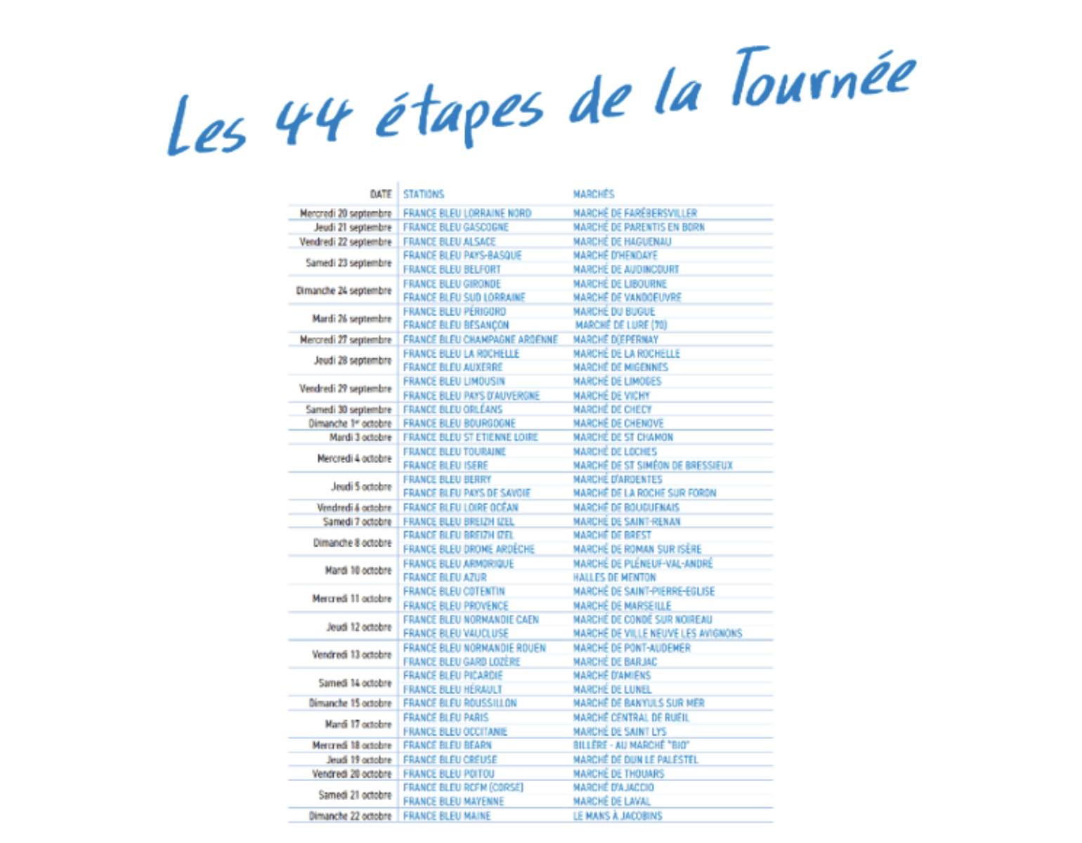 Quarante-trois des stations locales ont sélectionné 44 marchés de leur territoire. Chacune y réalisera une émission spéciale en direct de 9h à 11h. Sur place, un chef emblématique local aura un défi à relever autour de la cuisine locale installée pour l’occasion par France Bleu. Le défi pour un chef emblématique local : un repas complet pour 6 personnes avec 30 euros en poche.
