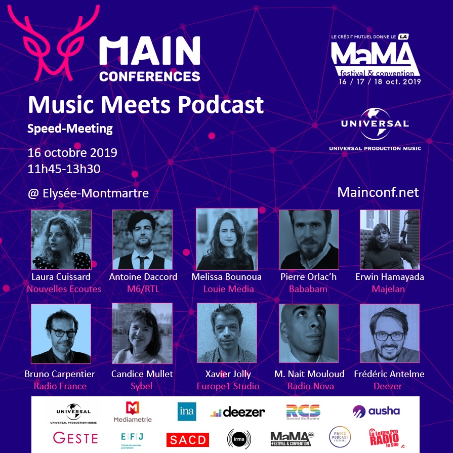 Première conférence, ce 16 octobre à 10h autour du thème Musique et Podcast en collaboration avec l'Irma avec la particpation notamment de Mélissa Bounoua (Louie Media) ou encore de Xavier Jolly (Europe 1). Puis, à 11h45 pour un Speed Meeting dénommé "Music Meets Podcast" en partenariat avec Universal Production Music avec la participation d'Antoine Daccord (M6/RTL), Frédéric Antelme (Deezer), Candice Mullet (Sybel), Bruno Carpentier (Radio France).... Enfin, ce 16 octobre toujours à 15h45 avec une conférence intitulée "Influence ou quelles opportunités pour les artistes" en collaboration avec l'Irma.
