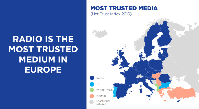 La radio est le média le plus fiable en Europe, obtenant le meilleur score dans 24 des 33 pays (pour 73% des personnes interrogées). Hormis le Portugal, les pays dans lesquels la radio n'est pas la plus fiable sont situés en Europe du Sud-Est © EBU Media Intelligence Service –Trust in Media 2020