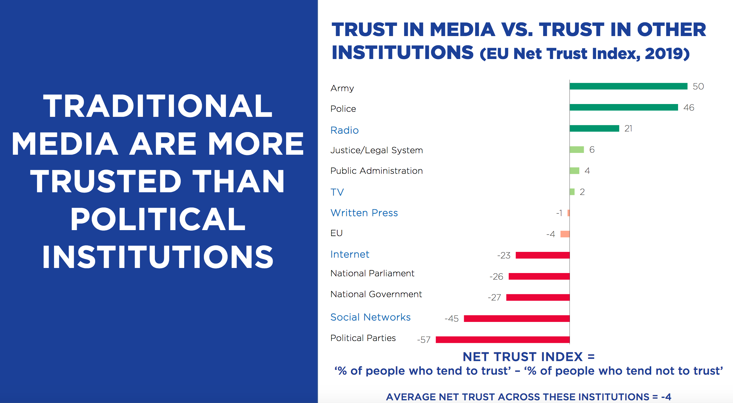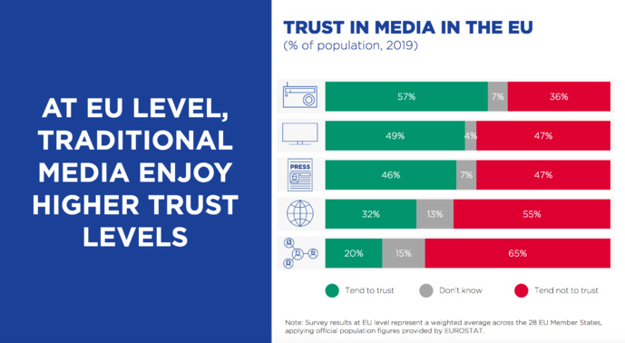 La confiance dans Internet et les réseaux sociaux a connu une baisse importante par rapport à des niveaux de confiance presque stables dans les médias traditionnels. Au cours des 5 dernières années, la confiance dans Internet a diminué dans 91% les pays étudiés, dont près de la moitié dans une large mesure. "Une confiance élevée dans les informations fournies par les médias nationaux signifie que les citoyens sont moins susceptibles de percevoir les fausses informations comme un problème. De plus, plus le niveau de confiance dans les médias audiovisuels d'un pays est élevé, plus la liberté de la presse est élevée dans ce pays. La forte corrélation suggère que la confiance des citoyens dans la radio et la télévision est liée à un paysage des médias d'information libre et indépendant" explique l'UER.