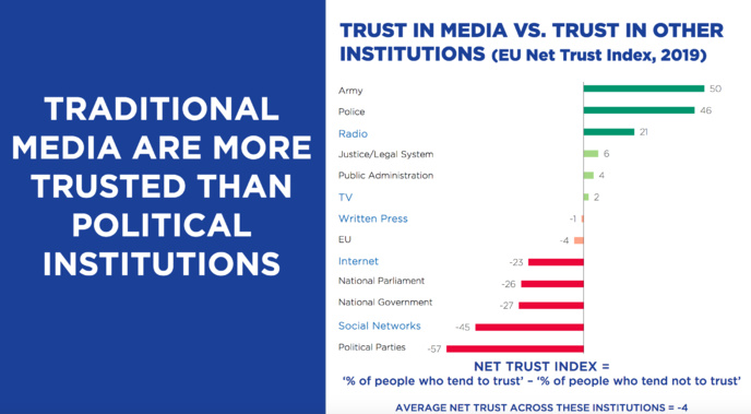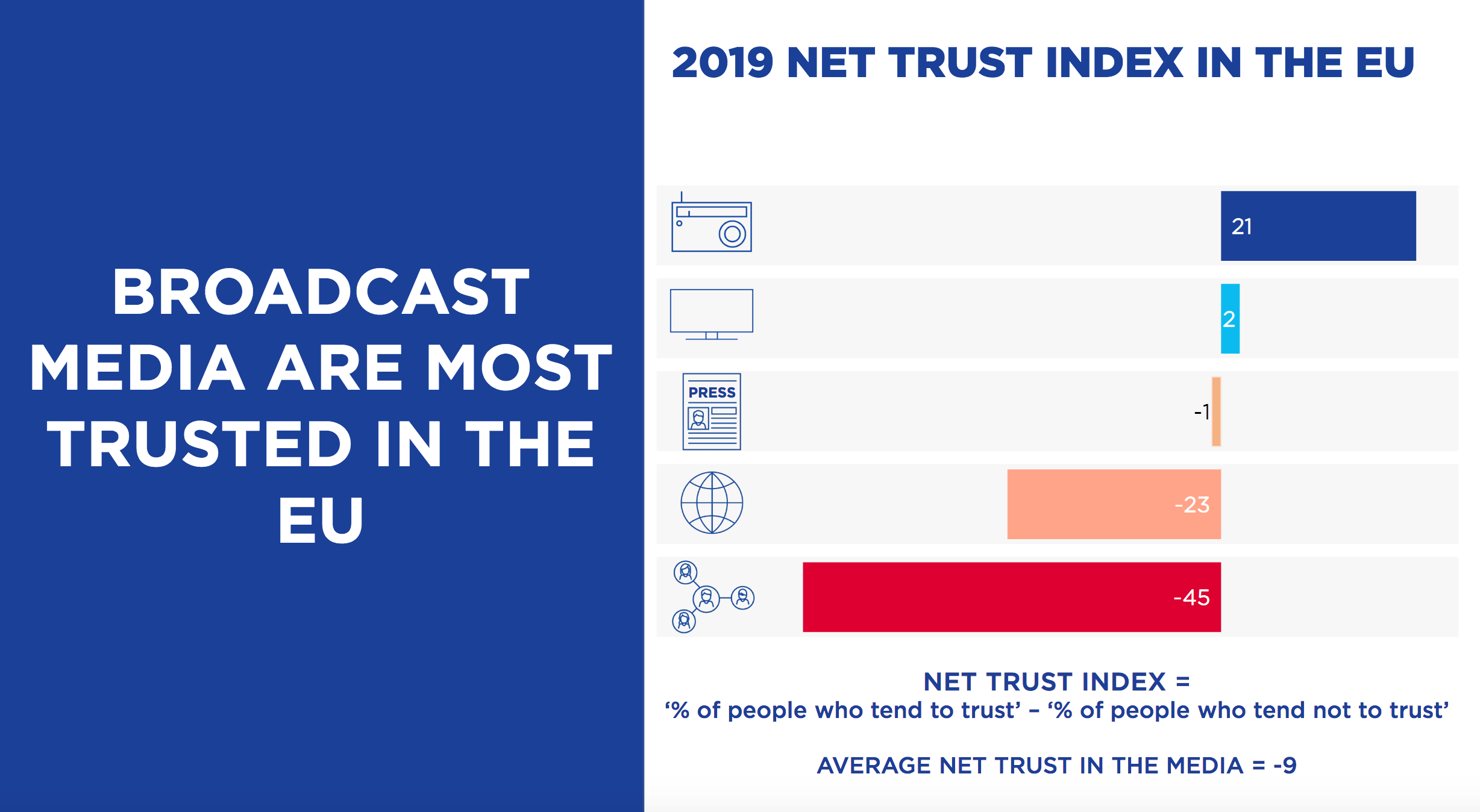 En 2019, seuls les médias audiovisuels (radio et télévision) ont des indices de confiance nets positifs, ce qui signifie que la majorité des citoyens de l'UE font confiance à ces médias. Internet et les réseaux sociaux sont loin derrière la presse écrite © EBU Media Intelligence Service –Trust in Media 2020