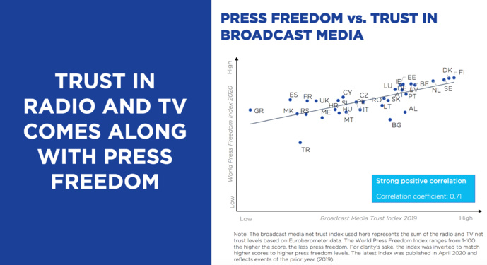 Plus le niveau de confiance dans les médias de radiodiffusion d'un pays est élevé (indices de confiance nets de la radio et de la télévision combinés), plus la liberté de la presse est élevée dans ce pays. La forte corrélation suggère que dans le contexte européen, la confiance des citoyens dans la radio et la télévision est étroitement liée à un paysage des médias d'information libre et indépendant © EBU Media Intelligence Service –Trust in Media 2020