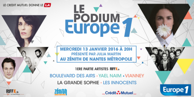 Europe 1 organisera un concert Podium à Nantes, le 13 janvier prochain. Yael Naim, Vianney, La Grande Sophie, Vianney, Boulevard des Airs et le groupe Les Innocents se succèderont sur la scène du Zénith de Nantes Métropole. L'animatrice Julia Martin présentera cette soirée.Brulhatour est le rédacteur en chef du magazine La Lettre Pro de la Radio et le directeur associé... En savoir plus sur cet auteur
