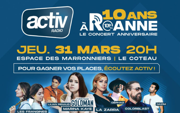 Pour remercier ses auditeurs et célébrer ses 10 ans de présence à Roanne, Activ organise donc un concert gratuit et offre toutes les places sur son antenne. De nombreux artistes seront présents comme Marina Kaye et Lilian Renaud qui interprèteront plusieurs titres de l’album "L’Héritage Goldman", la chanteuse québécoise La Zarra, 3e titre français le plus diffusé en radio, Les Frangines, Colorblast, le DJ producteur qui cartonne avec sa reprise de "Message In The Bottle" du groupe Police, Cephaz ou encore Nazim originaire de la Loire, qui a notamment composé pour Kendji. Pour gagner leurs places, les auditeurs doivent forcément écouter Activ sur le 101.6 à Roanne.