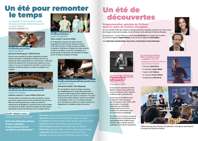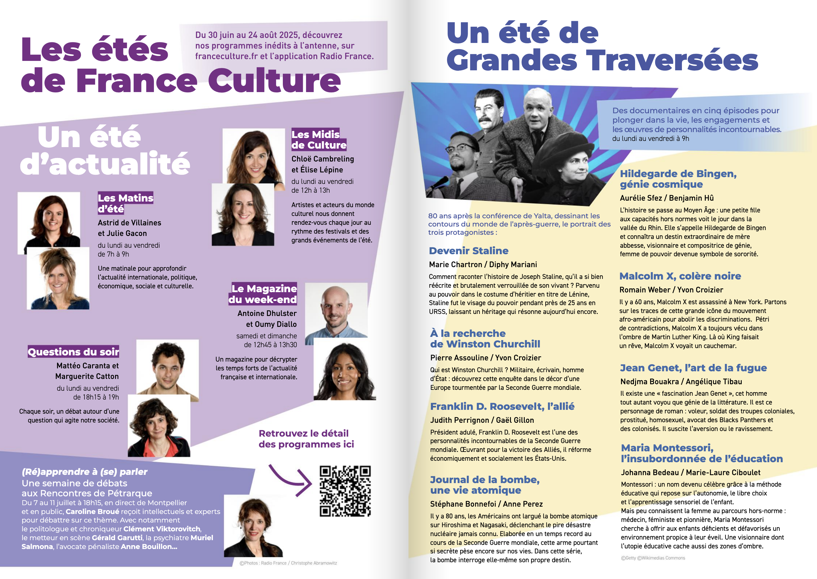 L’été 2025 de France Culture s’articule autour de trois axes : information, création et transmission. Du 30 juin au 24 août, la station maintient ses rendez-vous d’actualité tout en introduisant de nouvelles voix et des formats adaptés à la période estivale. "Les Matins d’été" (7h-9h), "Les Midis de Culture" (12h-13h), "Questions du soir "(18h15-19h) et "Le Magazine du week-end" (12h45-13h30) structurent la grille linéaire. L’ensemble est disponible à la demande sur le numérique.