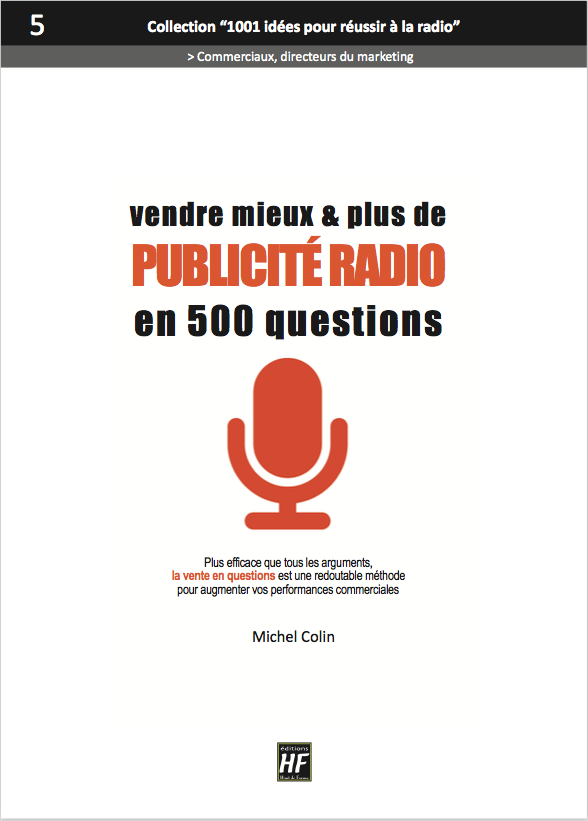 "Vendre mieux et plus de publicité radio en 500 questions" se présente comme un recueil de questions pertinentes qui transformera votre vision de la vente d’espaces publicitaires, rendant l’acte commercial créatif, expert et surtout enthousiasmant. "Le processus de vente est désormais traité de A à Z exclusivement à base de questions, pertinentes et perspicaces.Fini les arguments bateaux et les présentations soporifiques" souligne Michel Colin. Avec cette méthode pleine de bon sens, le vendeur devient un expert médias, capable d’analyses et de préconisations marketing, un vrai ingénieur en solutions de communication efficaces.