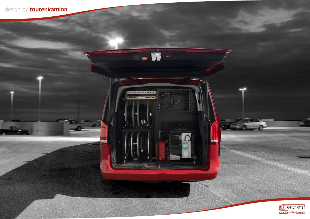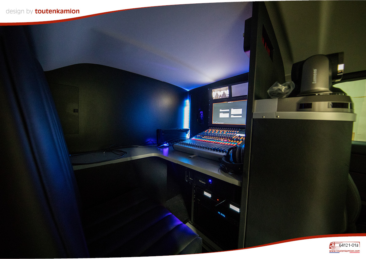 Les équipes toutenkamion ont pris en compte l'optimisation millimétrée de chaque agencement permettant de recevoir confortablement deux Invités, un Journaliste, un technicien tout en préservant un grand espace technique dédié aux rangements des moyens de captation extérieur et à l'autonomie du véhicule. Équipé d'une antenne satellite, ce véhicule d'enregistrement radio et vidéo peut transmettre en direct interviews et reportages. Produit de haute finition, toutenkamion a réussi à réaliser cet écrin haute couture pour l'intégration technique des moyens Audio Vidéo avec le concours de RTV Concept en charge de la configuration matérielle et de sa mise en service.