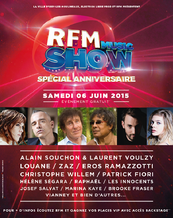 Ce concert, baptisé RFM Music Show, s'inscrit dans le cadre du 34e anniversaire de RFM. Il débutera à 19h au Parc départemental de l’Ile Saint-Germain à Issy-les-Moulineaux, le samedi 6 juin.