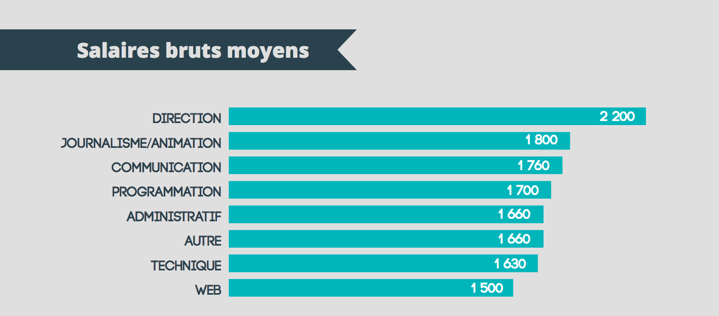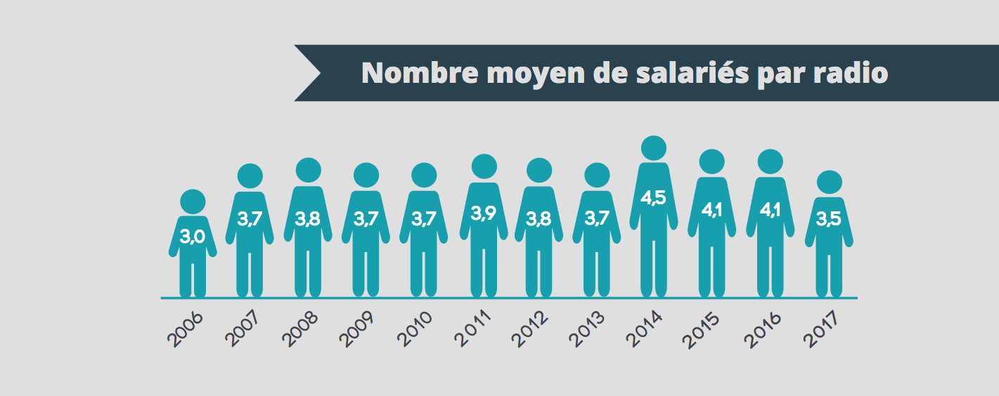 Ce sont les postes en CDD qui n’ont majoritairement pas été renouvelés. Ils représentent aujourd’hui 8% des effectifs, contre 28% des effectifs en 2016. Il y a dans l’ensemble un turnover constant dans les radios associatives qui emploient souvent des jeunes en début de carrière. La moyenne d’âge est de 38 ans et les salaires moyens sont inférieurs aux salaires du secteur privé. Les journalistes restent majoritaires dans les radios (32% des effectifs) devant les techniciens (20% des effectifs) et les postes de direction (14% des effectifs).