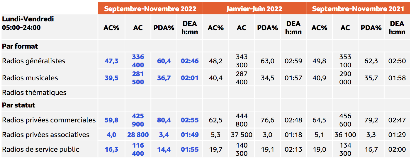 Cette étude, réalisée du 16 août au 20 novembre, dévoile les résultats des radios qui atteignent au moins 2 points d'audience cumulée. À La Réunion, un point d'audience correspond à 7 120 personnes. Le marché est clairement dominé par les Généralistes (47.3% d'audience cumulée et 60.4% de part de marché) écoutées chaque jour par 336 400 auditeurs contre 281 500 pour les Musicales. On notera aussi le poids non négligeable des radios associatives qui génèrent 4% d'audience cumulée (28 800 auditeurs).