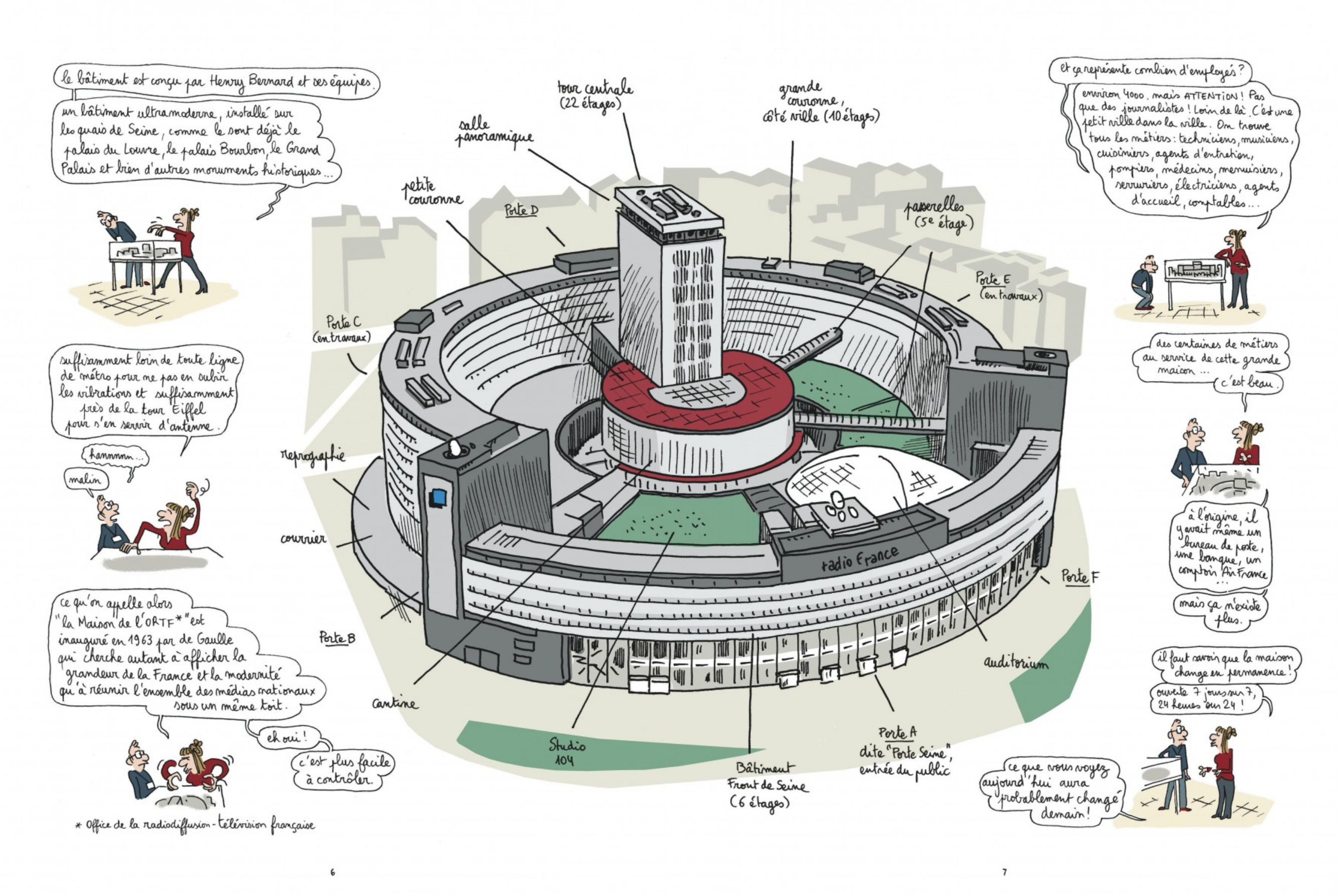 De jour comme de nuit, il a poussé des portes, assisté à de nombreuses émissions et rencontré bon nombre des 4 000 professionnels qui y travaillent. Il a arpenté d’interminables couloirs – "on marche tout le temps, on monte, on descend, on tourne [...] " –, il s’est parfois perdu, il a découvert des abris atomiques et des endroits étranges, comme le « centre distributeur de modulations » comparable au tambour d’une machine à laver ou encore à l’œil d’un cyclone...