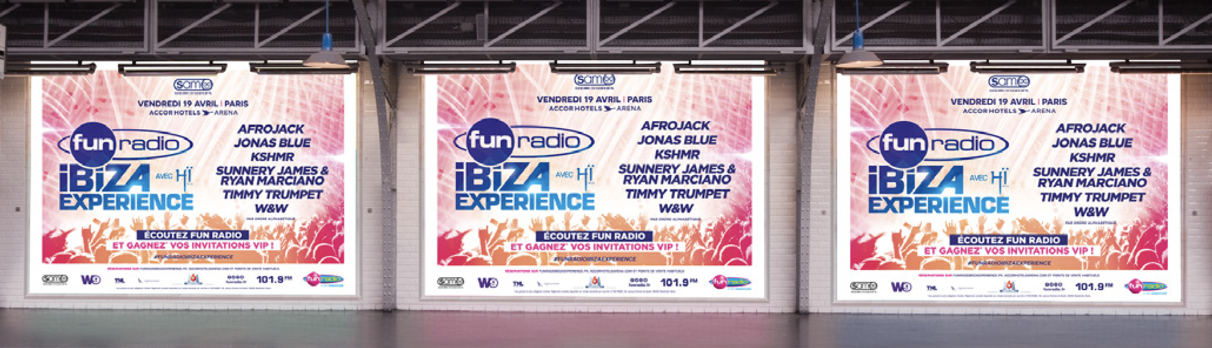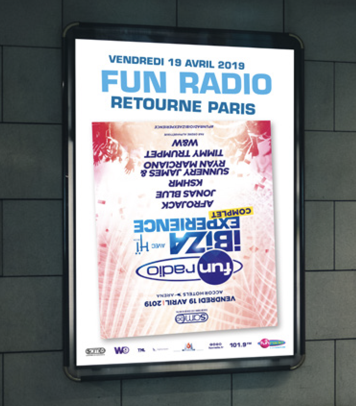 Dans le métro et le RER sur 300 faces dans 222 stations, avec une privatisation complète de certains quais. Cette campagne est soutenue par une opération de promotion "Fun Radio retourne Paris" dans 4 quartiers noctambules de la capitale (Bastille, Oberkampf, Strasbourg, Chatelet) avec 900 affiches. La station évoque "une expérience inédite diffusée en direct sur Fun Radio et en différé quelques jours plus tard sur W9".