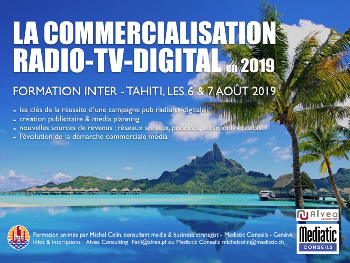 Organisée par Alvea Consulting et Mediatic Conseils, la formation sera animée par Michel Colin les 6 et 7 août 2019 à Papeete. Au programme : les clés de la réussite d’une campagne pub radio/tv/digitale, la création publicitaire et le media planning, les nouvelles sources de revenus (réseaux sociaux, podcasts, audio online, datas…) ou encore l’évolution de la démarche commerciale média. Les principales régies publicitaires, télévisions et radios polynésiennes sont déjà inscrites pour ces deux journées de formation inter qui se déroulera les 6 et 7 août prochains avec Michel Colin.