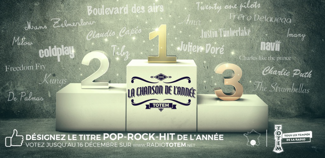 Durant la quinzaine des fêtes, du 19 au 30 décembre, Totem propose "La chanson de l’année Totem" à 16h40 dans "Le Truc à la cool" et dévoilera le classement 2016 des auditeurs. Des auditeurs qui sont invités à voter parmi les 20 titres que la radio a le plus diffusé cette année. Tous les jours, la radio diffuse l'un des titres du Top 10 pour arriver au n°1 qui sera révélé le 30 décembre à 16h40.