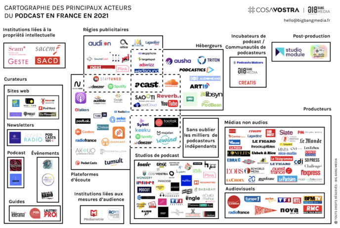 Il est toujours intéressant de parcourir une cartographie du podcast : on gagne du temps grâce à un seul coup d’œil et on observe, au fil des mises à jour, comment cette jeune industrie se structure. En France, des curateurs aux incubateurs, des plateformes d'écoute aux régies publicitaires, des hébergeurs aux institutions liées à la mesure d'audience... cette industrie se structure progressivement et accueille désormais, des acteurs solidement implantés.
