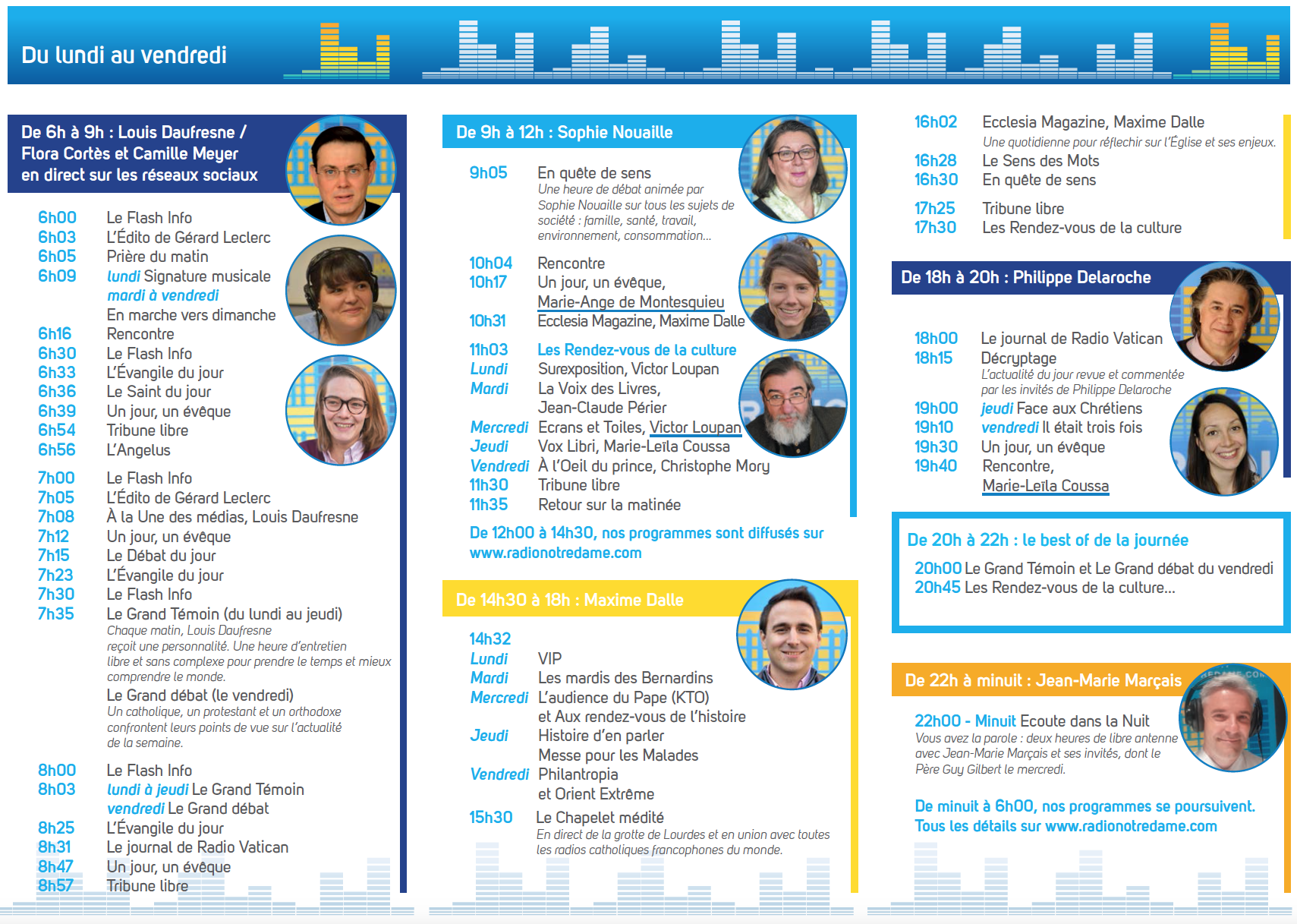 Les auditeurs de Radio Notre Dame retrouvent leurs programmes habituels (les matinales, le grand témoin, le débat du soir, les magazines culturels…) et Radio Notre Dame continue bien sûr à faire vivre et enrichir sa dimension spirituelle par de nombreux rendez-vous. Parmi les autres temps forts, on retiendra le 9/12 animé par Sophie Nouaille pour "En quête de sens" autour d'un débat interactif du lundi au vendredi en direct de 9h à 10h. Maxime Dalle présente "Ecclesia Magazine", du lundi au vendredi, à 10h30, une émission quotidienne de 26 minutes sur l’actualité de l’Eglise dans toutes ses dimensions.