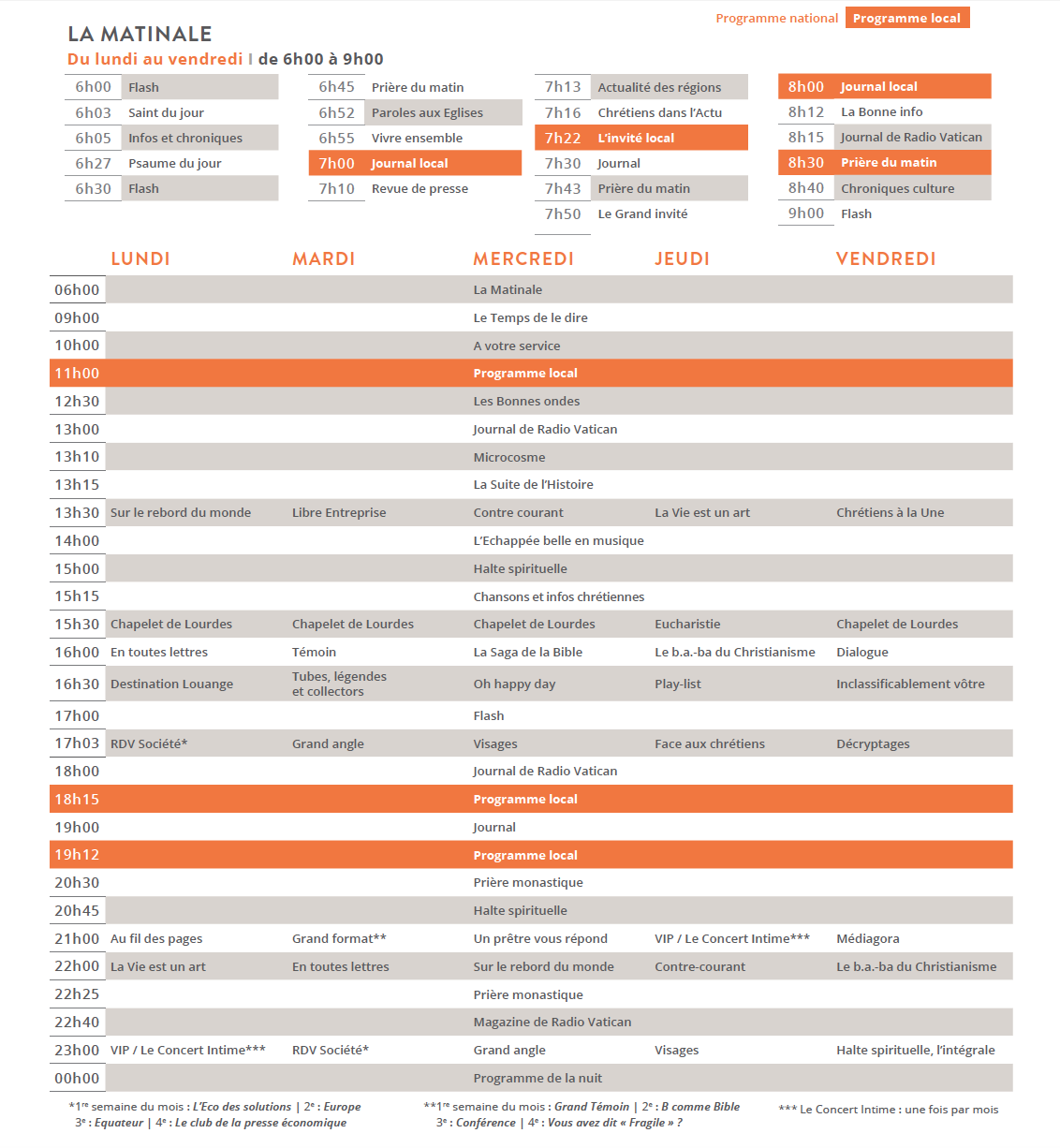 Dès 6h du matin, du lundi au vendredi et le week-end dès 6h30, information, prière et culture sont au rendez-vous. Trois heures de direct accompagnées avec enthousiasme et passion par François Ballarin, avec des journalistes, des chroniqueurs, des éditorialistes et l’ensemble du réseau RCF. "Une matinale en prise avec la vie ponctuée de temps de respiration spirituelle" explique le réseau. Tous les jours, RCF diffusera également les journaux de Radio Vatican à 8h15, 13h et 18h. Et tous les soirs à 22h40, le Magazine de Radio Vatican permettra aussi d’être informé de l’actualité du monde en direct de Rome.