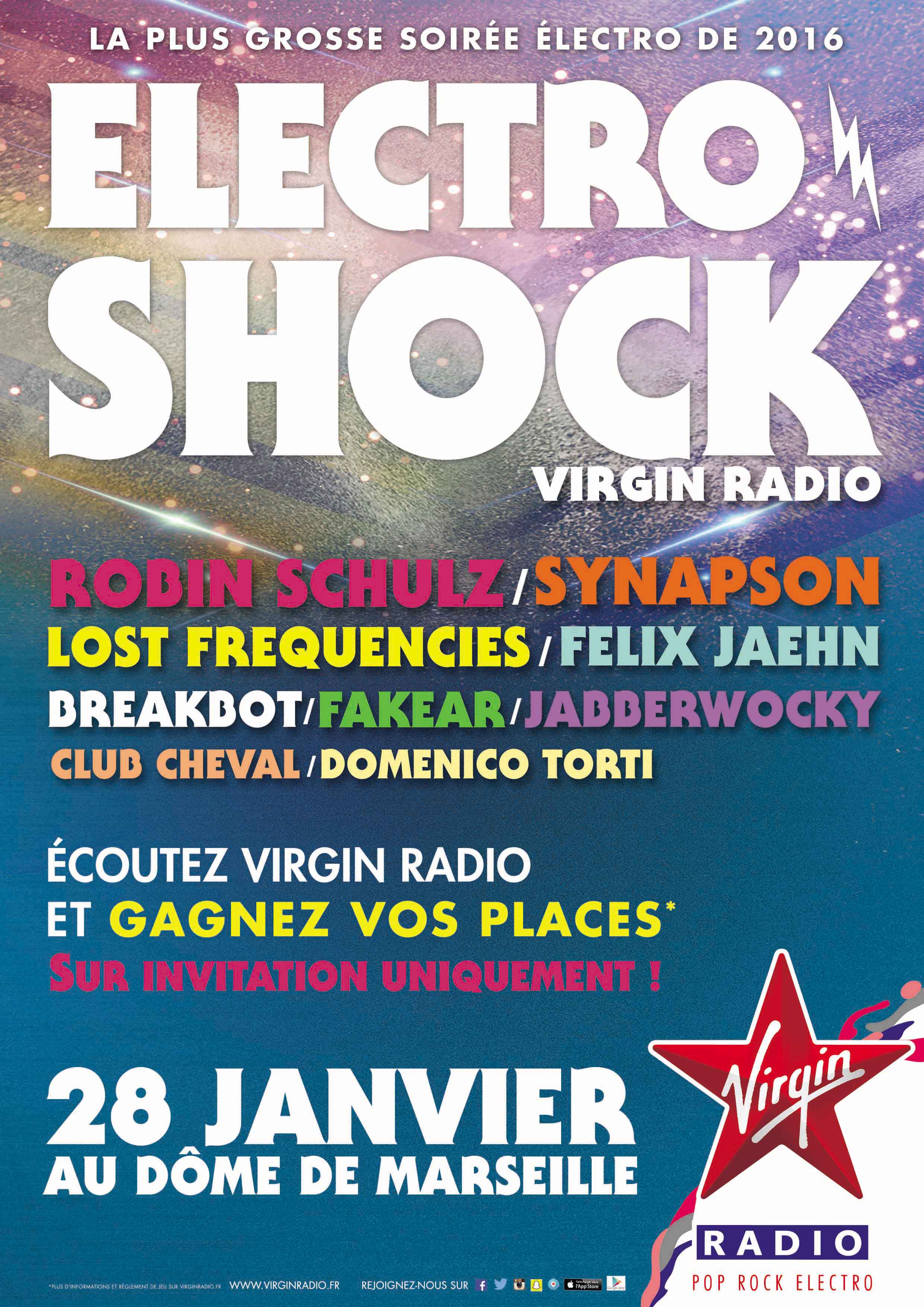 Les soirées ElectroShock Virgin Radio sont devenues une référence pour les passionnés d'Electro. Les Zéniths de Lille et de Paris ont déjà permis à des milliers d'auditeurs, venus de toute la France, de danser au son du Meilleur de l'Electro by Virgin Radio. Le 28 Janvier prochain, les plus grands DJ du moment seront à nouveau au rendez-vous pour investir le Dôme de Marseille, qui vibrera au son Electro Virgin Radio.