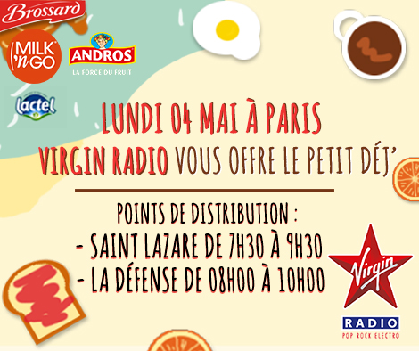 Ce lundi 4 mai, l'équipe de Virgin Radio viendra à la rencontre des parisiens pour leur offrir le petit déjeuner. Au menu, boissons et nourriture pour bien démarrer la journée.