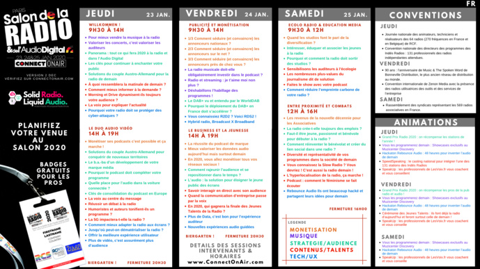 En 2020, le Salon de la Radio accueille la "Journée RCF ". Le réseau RCF (64 radios et 270 fréquences en France et en Belgique) réunit l’ensemble de ses animateurs, techniciens et réalisateurs durant une journée au Salon de la radio et de l’Audio Digitale. Une convention nationale pour échanger, partager les expériences, réfléchir à des points d'améliorations et présenter aussi la feuille de route des évolutions technologiques au service des métiers au sein du réseau Comme chaque année, le Salon de la Radio et de l’Audio Digital accueille la convention nationale des directeurs de programmes des Indés Radios. Les 131 stations se réuniront à huis-clos pour évoquer leur stratégie.