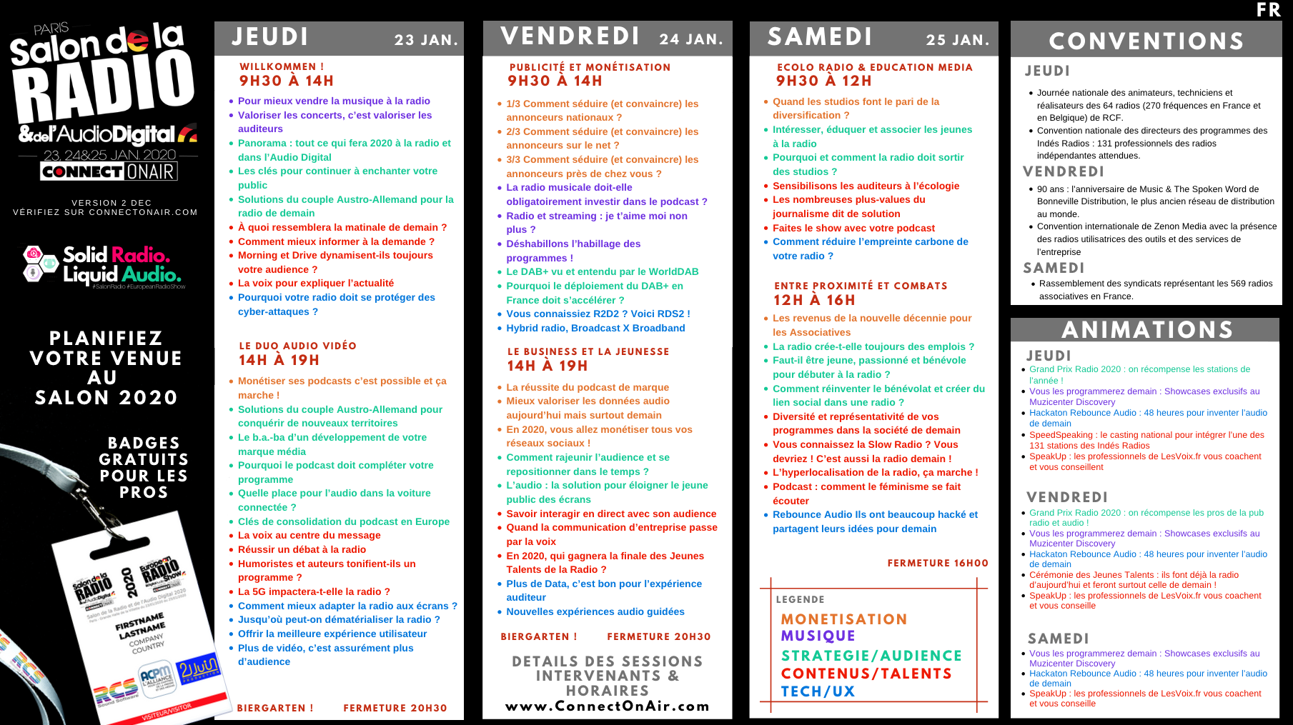 Le programme du Salon de la Radio et de l'Audio Digital est toujours très riche. Et, en 2020, plus de 80 sessions vous attendent sans compter les Masterclass, l'AudioClasroom, le Muzicenter Discovery et ses showcases et notre nouvel espace dédié au Podcast Le POD.Village qui aura sa propre programmation en plus des sessions dédiées du programme principal. En 2020, le Salon de la Radio et de l'Audio Digital prend encore de l'ampleur. Avec plus de 8000 visiteurs attendus (dont 35% d'internationaux), 160 exposants et plus d'une centaine de conférences, masterclasses et ateliers spécialisés en 3 jours, le salon devient l'évènement le plus important du secteur en Europe. Thématique en 2020 : "Solid Radio. Liquid Audio ".