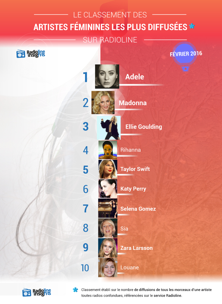 Elle est première de ce classement depuis la sortie de son tube "Hello" en novembre 2015, et continue de monopoliser la tête du classement ce mois-ci : la chanteuse britannique Adele est une fois de plus l’artiste la plus diffusée à la radio en février. En deuxième position, on retrouve l’inépuisable Madonna, en pleine tournée mondiale avec son Rebel Heart Tour. La britannique Ellie Goulding est troisième de ce classement féminin. La suite du classement est composée d’autres stars internationales comme Rihanna, Taylor Swift ou encore Zara Larsson. A noter tout de même la très bonne performance de la récente lauréate des Victoires de la Musique Louane, seule artiste française à figurer dans ce classement.