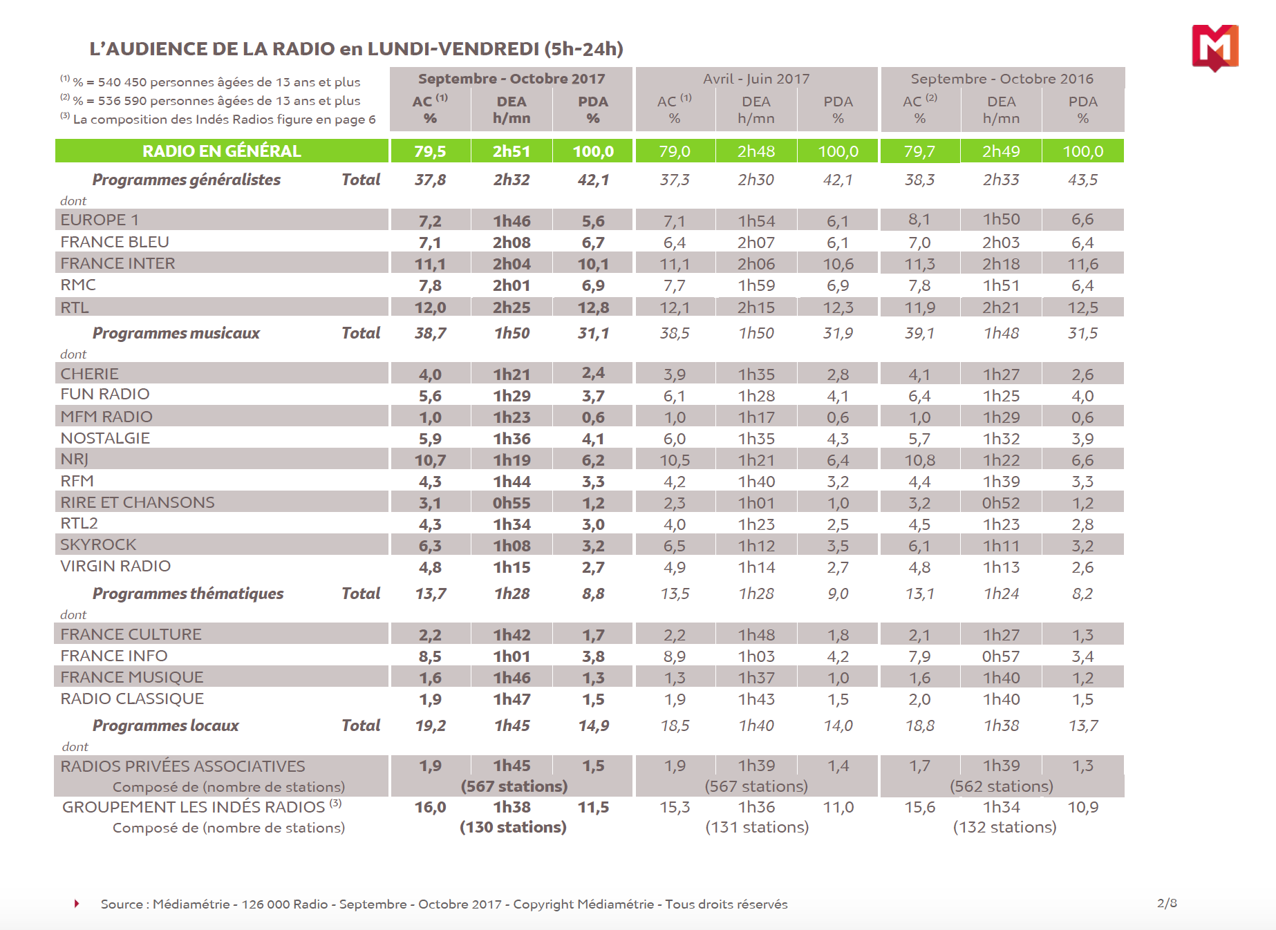 Rappelons que les résultats de l'enquête 126 000 Radio sont publiés 4 fois par an sur les périodes janvier/mars (sortie mi-avril), avril/juin (sortie mi-juillet), septembre/octobre (sortie mi-novembre) et novembre/décembre (sortie mi-janvier).