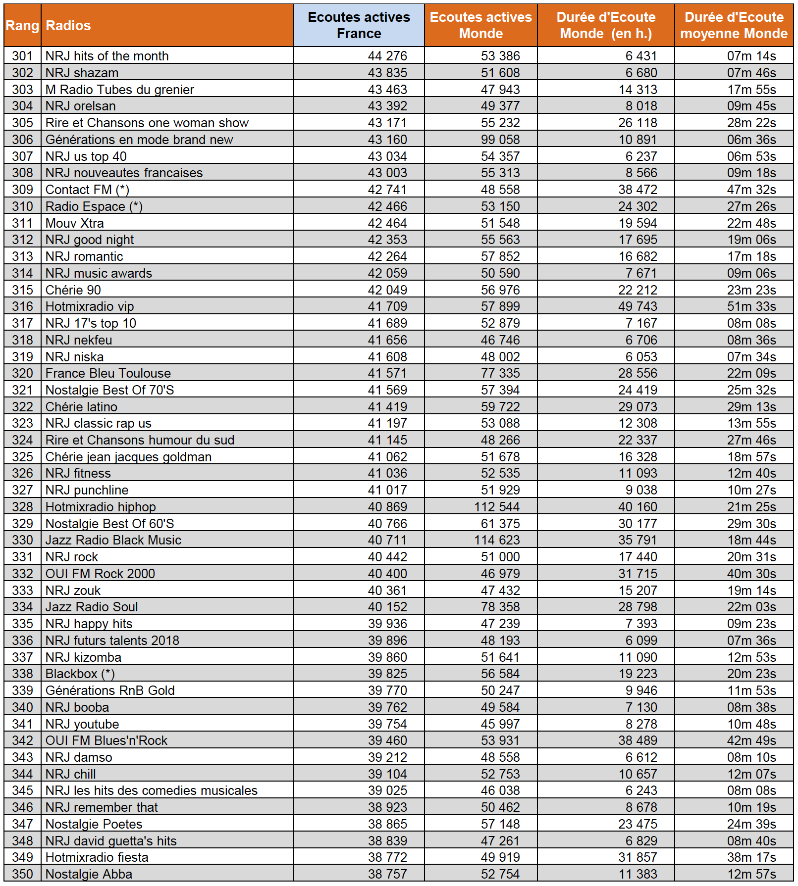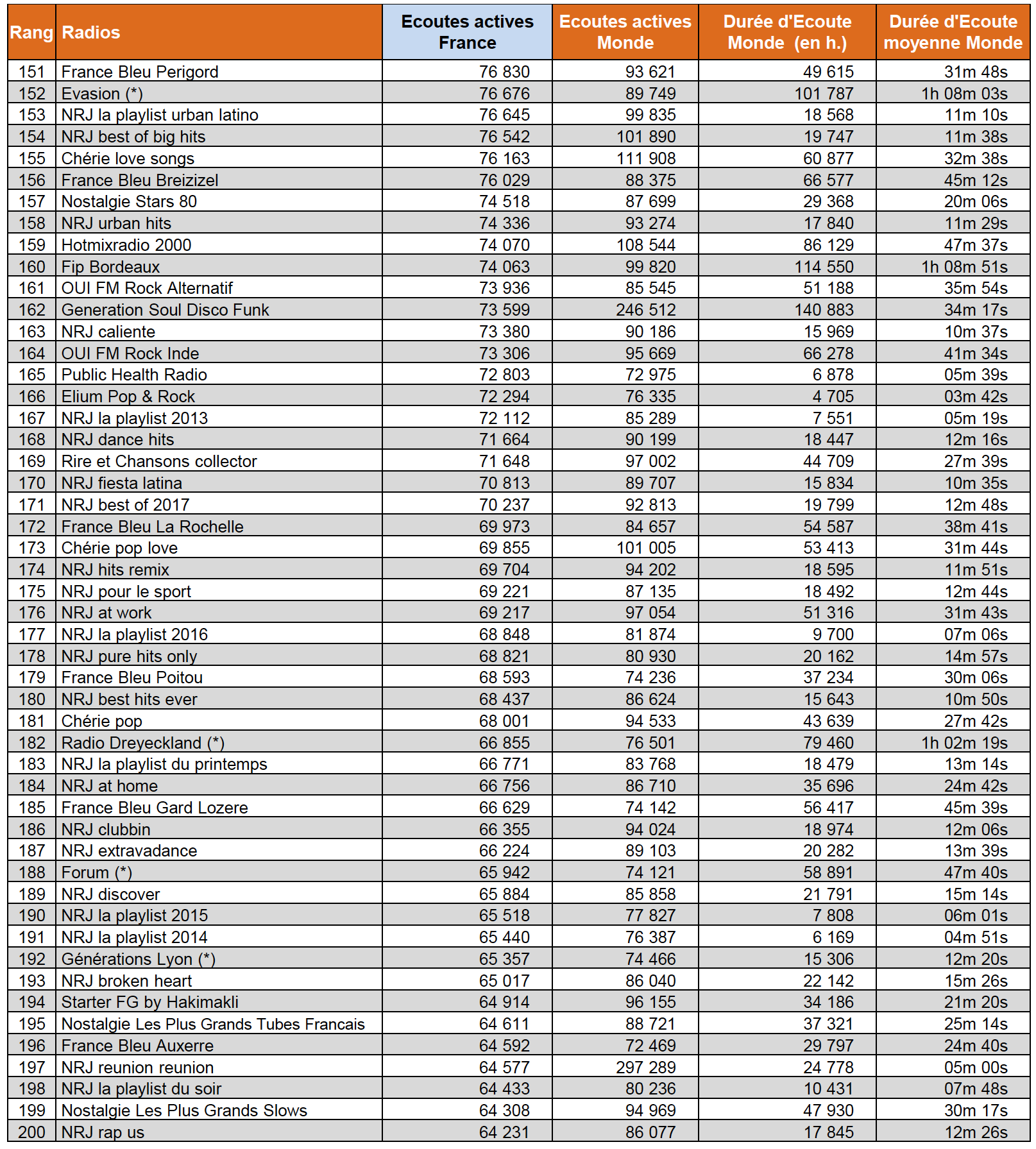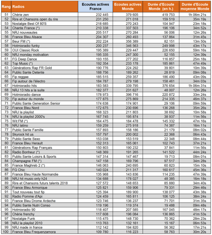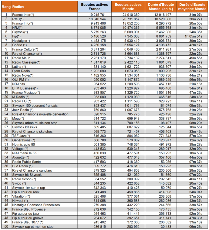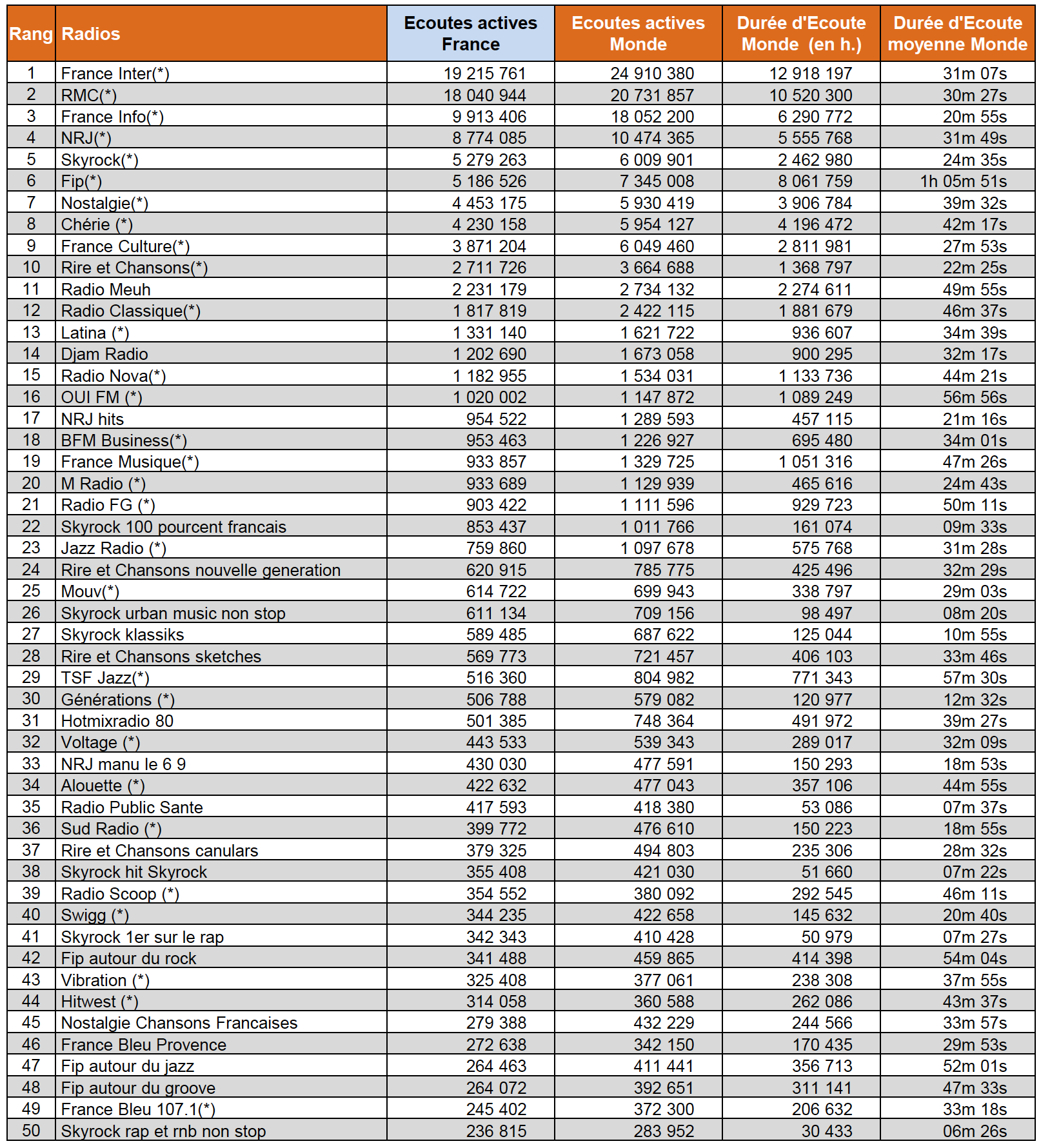 La première place du classement par groupes est détenue par Radio France avec 45 548 328 écoutes actives depuis la France grâce à 70 flux différents. C'est le groupe Oui FM qui génère la plus longue durée d'écoute avec plus de 45 min grâce à 21 flux différents. Radionomy Group motorise le plus de flux différents : 10 043 !