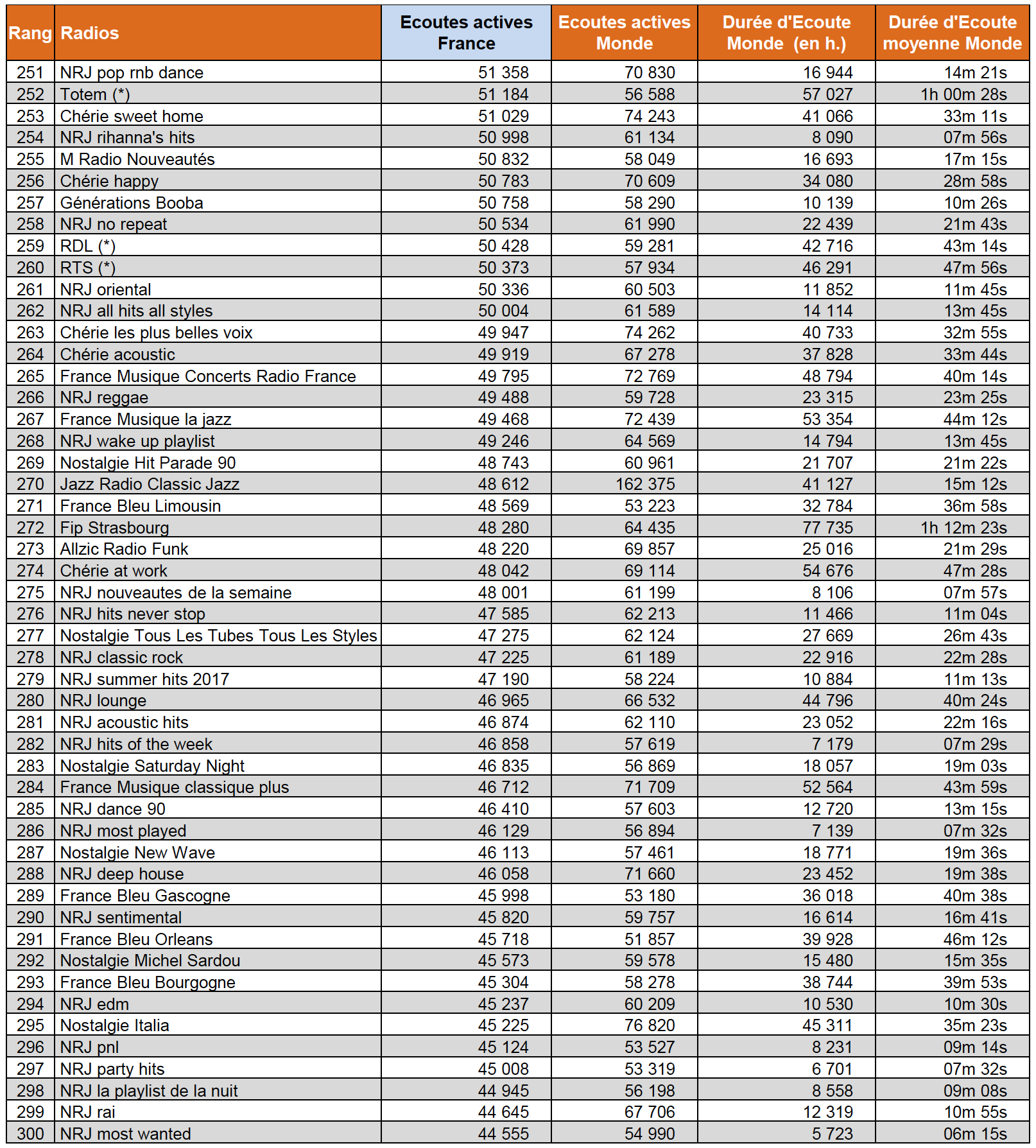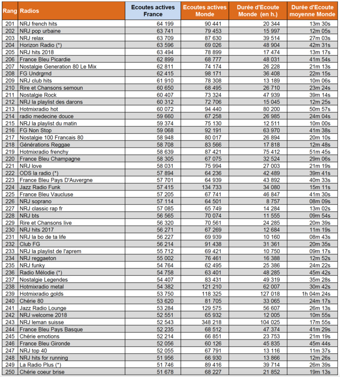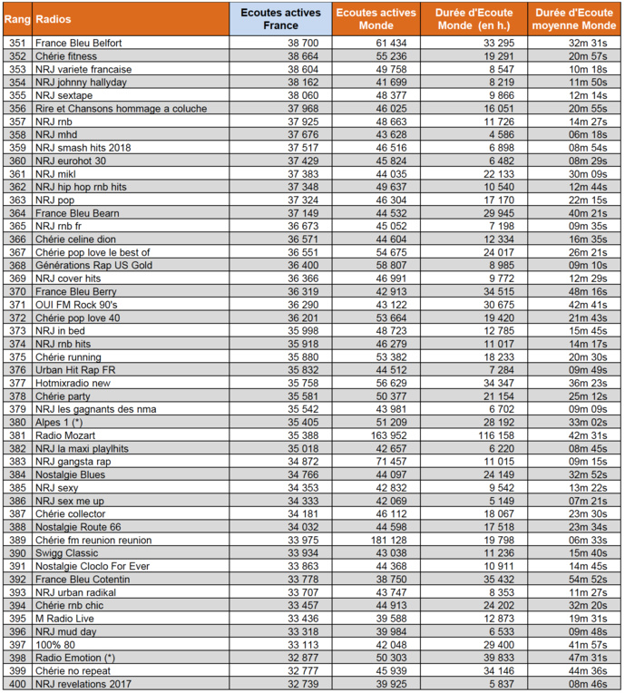 Le classement par marques est également intéressant car on y trouve une multitude de flux régionaux très puissants comme Voltage, Alouette, Wit FM, 100% ou encore Totem, Lor FM, K6FM et Jordanne FM.