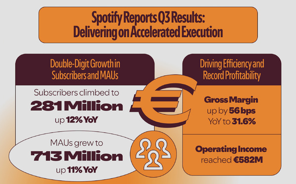 Selon le rapport financier publié par Spotify, la plateforme dépasse les 700 millions d’utilisateurs actifs mensuels et affiche une croissance à deux chiffres de ses abonnés payants. Les revenus progressent de 12% à 4.3 milliards d’euros et la marge brute atteint 31.6%, portée par l’efficacité et l’innovation audio.