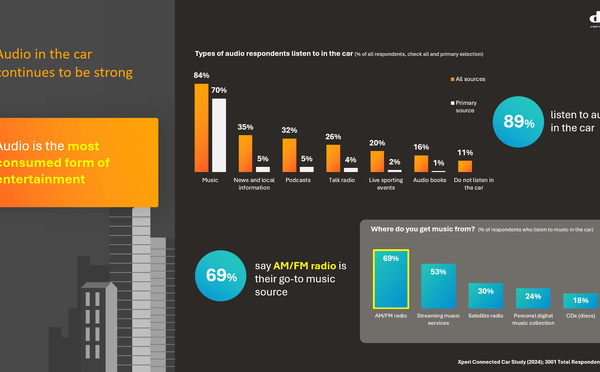 Alors que l’équipement vidéo embarqué progresse, la radio AM/FM reste, en 2024, la première source d’écoute audio en voiture. Selon l’étude Xperi menée auprès de 3001 répondants aux États-Unis, 89% des usagers consomment de l’audio en voiture, et 69% identifient la radio AM/FM comme leur source principale de musique.