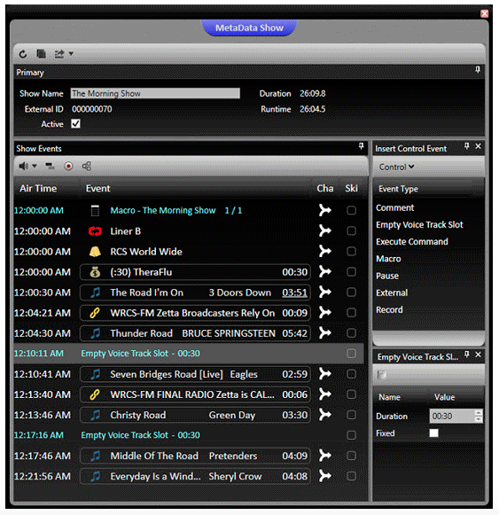 Ce programme peut contenir des titres, des jingles, des voice-tracks, et également des macros. A l'intérieur de ce "Show", vous pouvez aussi modifier vos points d'enchainements, comme si vous étiez dans un multi-piste ou dans votre éditeur d'enchainement. Ce "Show" peut ensuite être intégré à votre programme général, via un simple "drag & drop" dans votre log Zetta, et peut même être joué dans une cartouche de Hot-Key.