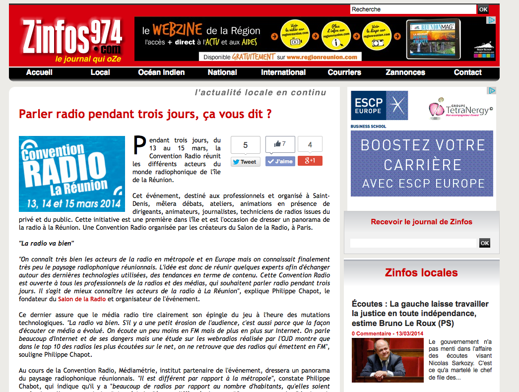 Au cours de la Convention Radio, Médiamétrie, institut partenaire de l'événement, dressera un panorama du paysage radiophonique réunionnais. "Il est différent par rapport à la métropole", constate Philippe Chabot, qui indique qu'il y a "beaucoup de radios par rapport au nombre d'habitants, qu'elles soient professionnelles ou associatives". La période d'écoute diffère également. "On constate que les Réunionnais se lèvent plus tôt qu'en métropole, puisque les meilleurs scores d'audience en matinale arrivent une heure plus tôt", grosso modo 7h au lieu de 8h.