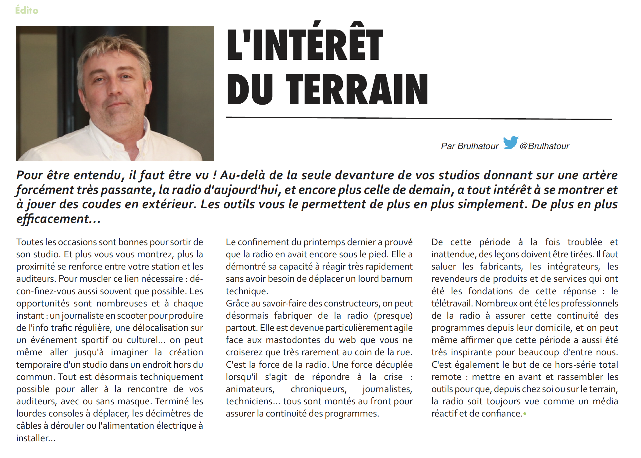 De cette période à la fois troublée et inattendue, des leçons doivent être tirées. Il faut saluer les fabricants, les intégrateurs, les revendeurs de produits et de services qui ont été les fondations de cette réponse : le télétravail. Nombreux ont été les professionnels de la radio à assurer cette continuité des programmes depuis leur domicile, et on peut même affirmer que cette période a aussi été très inspirante pour beaucoup d'entre nous. C'est également le but de ce hors-série total remote : mettre en avant et rassembler les outils pour que, depuis chez soi ou sur le terrain, la radio soit toujours vue comme un média réactif et de confiance.