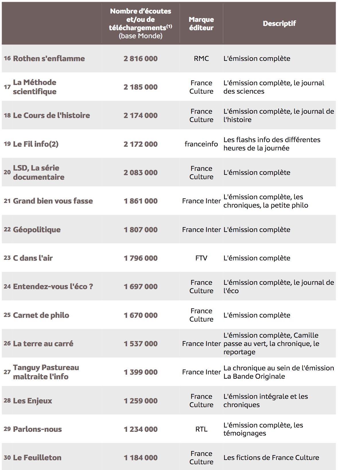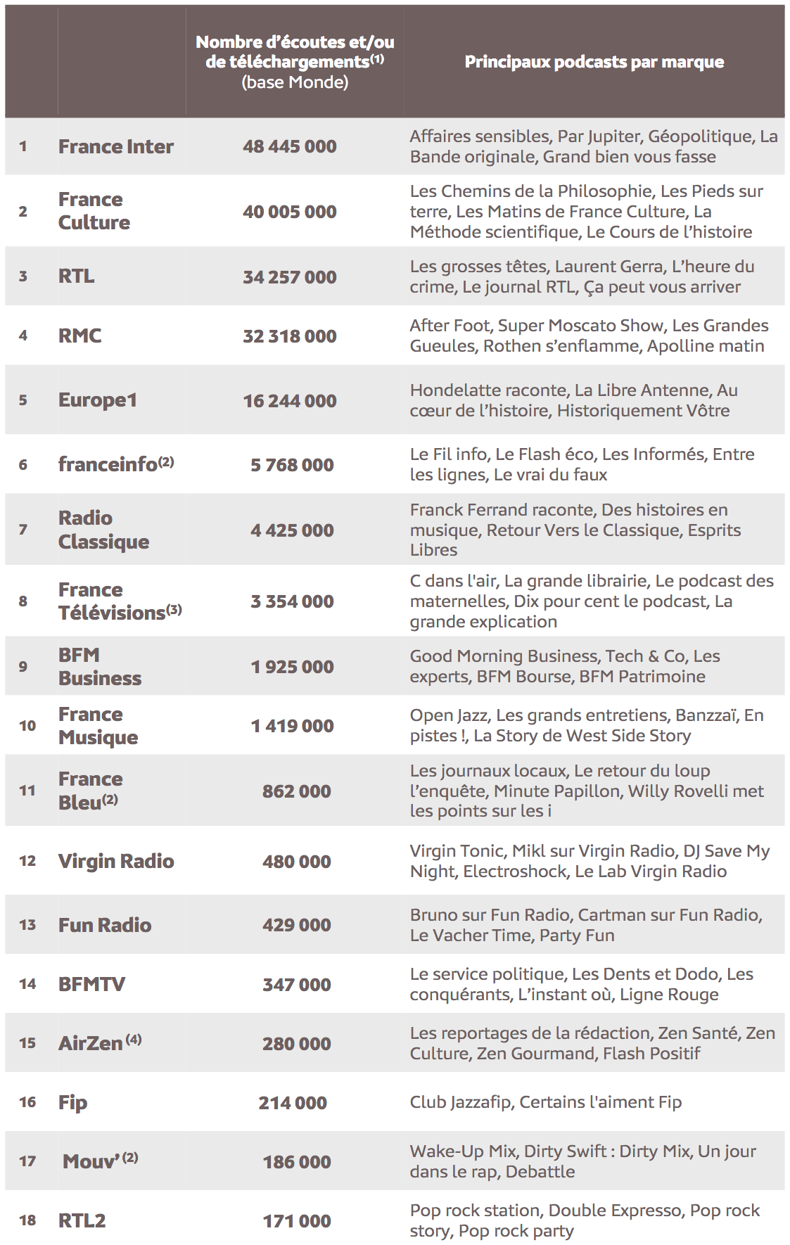 En mai, France Inter est toujours la radio dont les podcasts sont les plus téléchargés en France : près de 50 millions de téléchargements. Suivent France Culture (40 005 000), RTL (34 257 000), RMC ( (32 318 000) et Europe 1 (16 244 000).