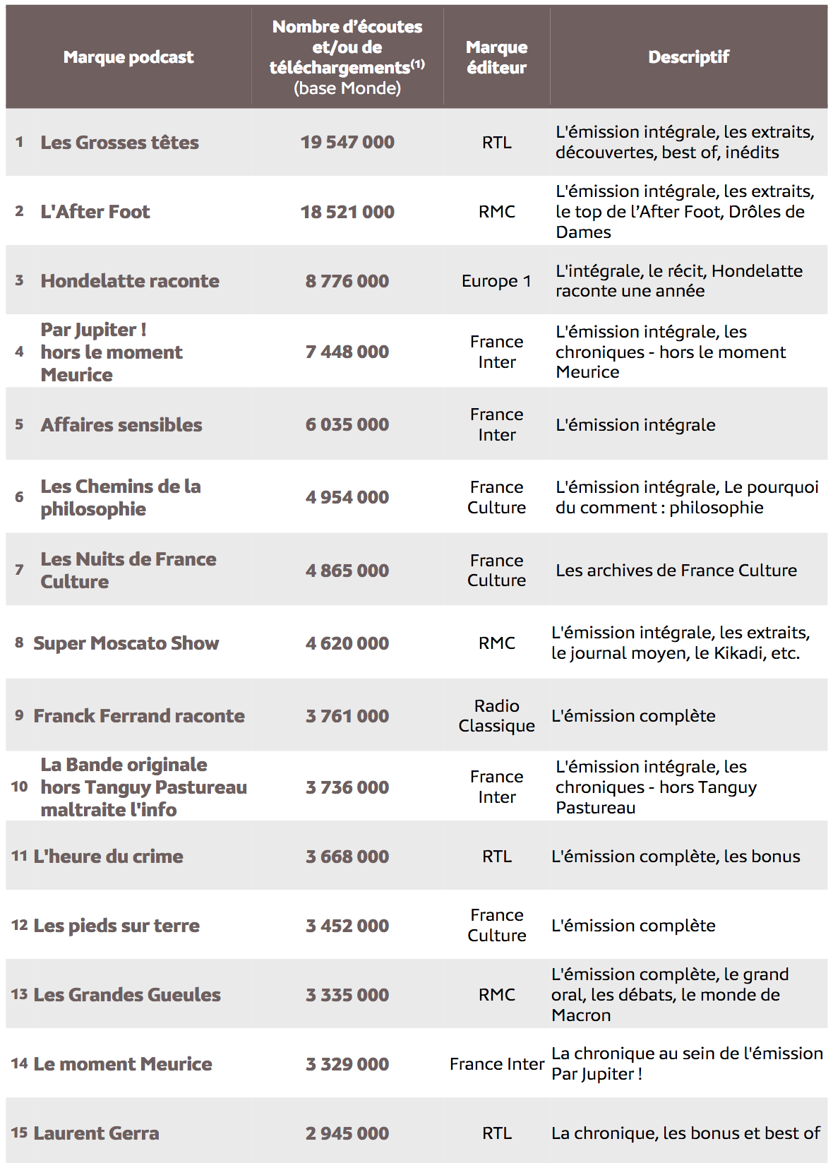 La place de l'émission la plus podcastée est toujours très disputée par deux programmes : "Les Grosses Têtes" sur RTL (19 547 000) et "L'After Foot" sur RMC (18 521 000).