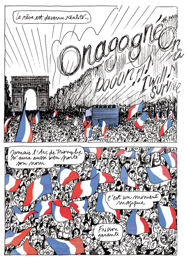 Dans cet ouvrage, 40 auteurs de bande dessinée, illustrateurs ou scénaristes revisitent les grands événements de ces dernières décennies. Parmi eux, certains lauréats du Prix franceinfo: comme Luz qui a croqué la campagne des candidats à l’élection présidentielle de 2017. Mais aussi, des auteurs invités comme Catherine Meurisse qui imagine le Nobel de littérature Patrick Modiano porté par une foule joyeuse et fédératrice à l’instar de celle qui saluait fièrement la coupe du monde de football à Paris en 1998.