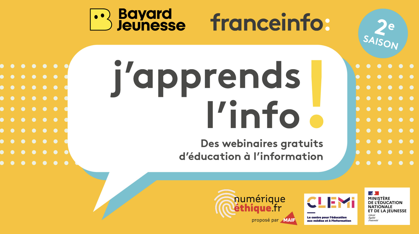 Coup d’envoi de la saison 2 de "J'apprends l’info !" le jeudi 20 mars avec des webinaires à suivre en présentiel, à la Maison de la Radio et de la Musique et en streaming. S’en suivra tout au long de l’année, une offre de webinaires à suivre avec les élèves en streaming interactif et en replay grâce à des kits pédagogiques mis à disposition sur franceinfo.fr pour approfondir et continuer à travailler en classe.