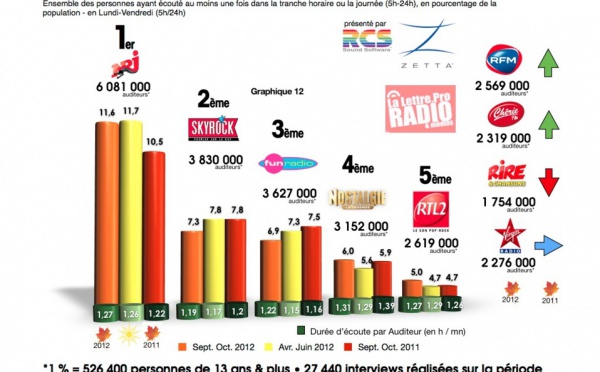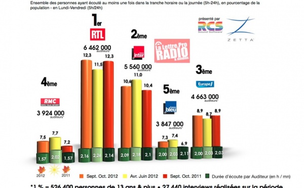 Diagramme exclusif LLP/RCS Zetta - TOP 5 radios généralistes - 126 000 septembre/octobre 2012 - Le 14/11/2012 à 10:50Diagramme exclusif LLP/RCS Zetta - TOP 5 radios musicales - 126 000 septembre/octobre 2012 - Le 14/11/2012 à 10:49 |